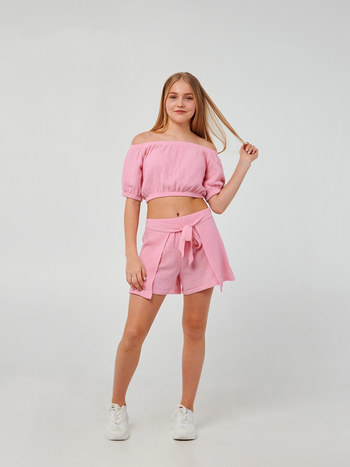 Шорти для дівчинки оригінальний крій яких додасть її образу грайливості та вишуканості, додаючи нотки стилю у кожне вбрання. Пошиті з легкого, м'якого та еластичного мусліну, наші шорти забезпечують максимальний комфорт протягом дня. Яскравий колір додасть свіжості та додасть літнього радісного настрою, роблячи вашу дівчинку стильною та неповторною. Зав'язки попереду шортів зав'язуються в гарний ніжний бант.