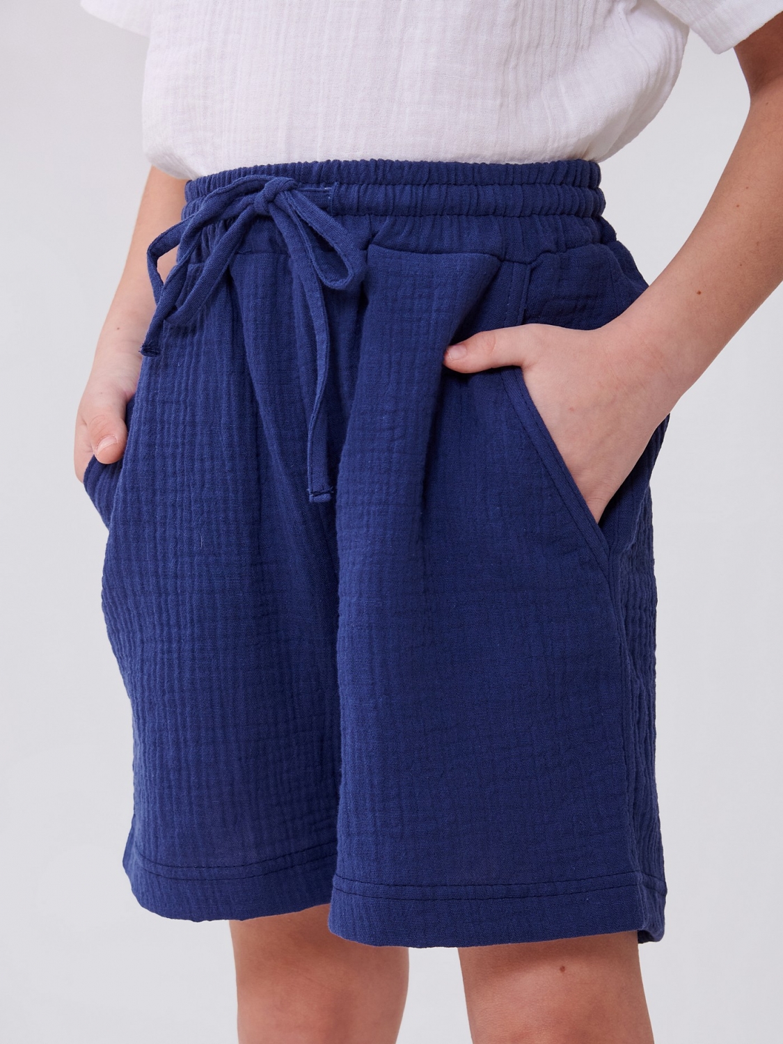 Шорти для хлопчика темно-синього кольору ідеальний вибір для активних літніх днів! Практичні кишені та зав'язка додають зручності та стилю. Легке та повітропроникне муслінове полотно дарує комфорт та свободу рухів. Ці шорти підійдуть для прогулянок, ігор та пригод на свіжому повітрі, забезпечуючи хлопчику максимум зручності та впевненості у кожному кроці.