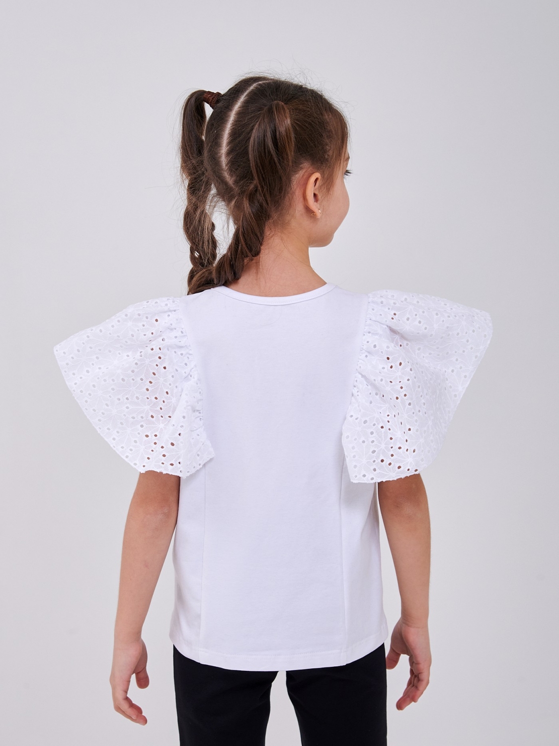 Додайте трохи чарівництва в гардероб вашої дівчинки з нашими стильними блузками з мереживними рукавами. Ніжна, легка та елегантна біла блузка для дівчинки. Полотно стрейчевий кулір сюїд для максимального комфорту. Ідеально для свят, школи та стильних буднів.