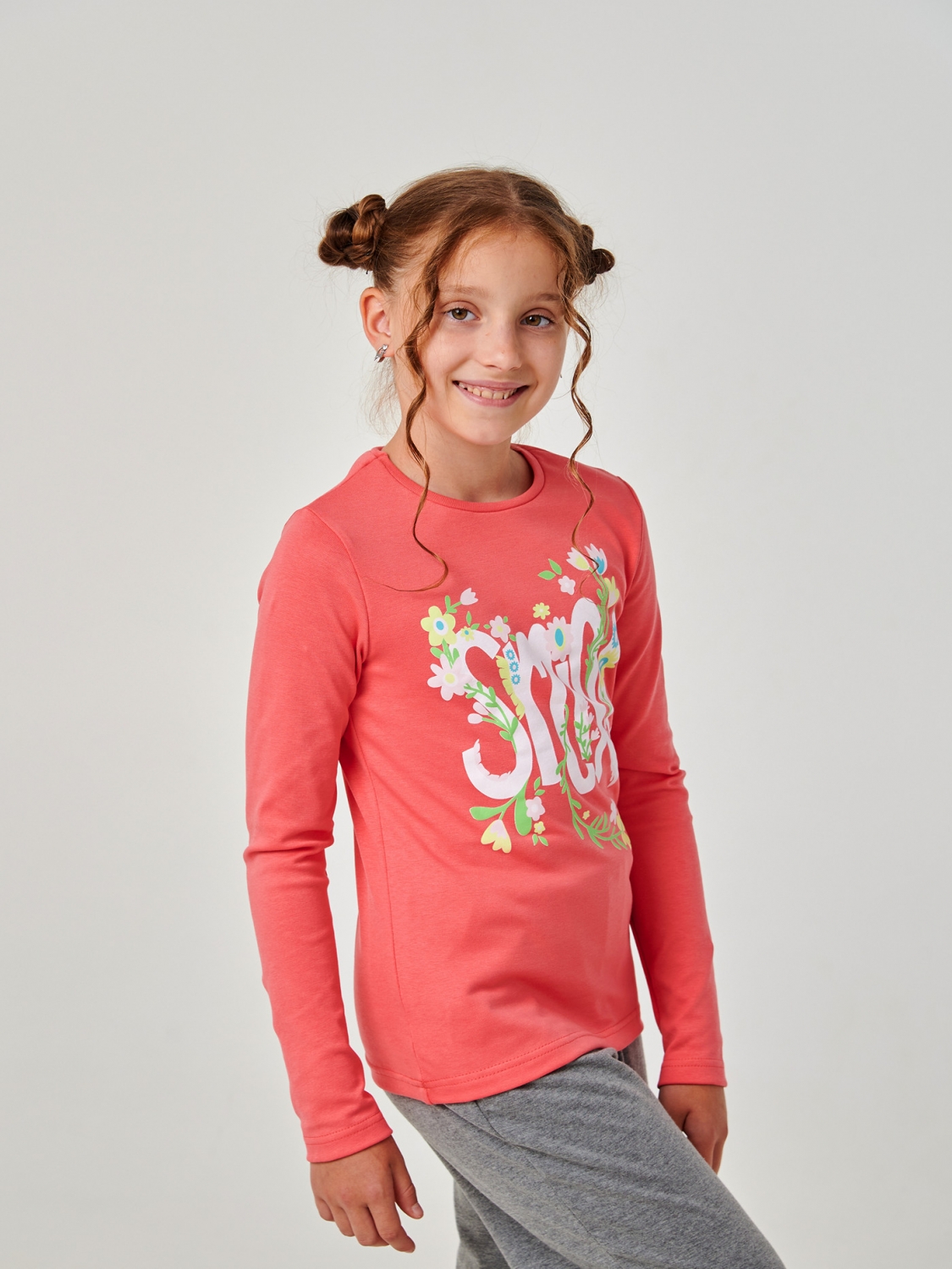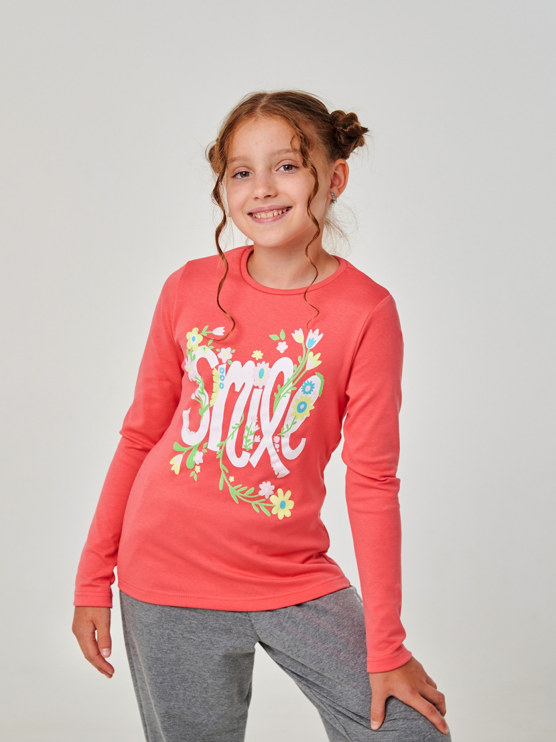 Футболка з довгим рукавом для дівчинки пошита із зручної стрейчевої гумки, яка гарантує неймовірну свободу руху та комфорт у будь-якій ситуації. Напис 'Smile', оточений ніжними квітами, надає цій футболці ніжності та позитивного настрою. Друк не тріскається і не знімається після прання, що гарантує довговічність та яскравість дизайну. Доступна в ніжних та яскравих кольорах. Футболка ідеально підходить для повсякденного носіння.