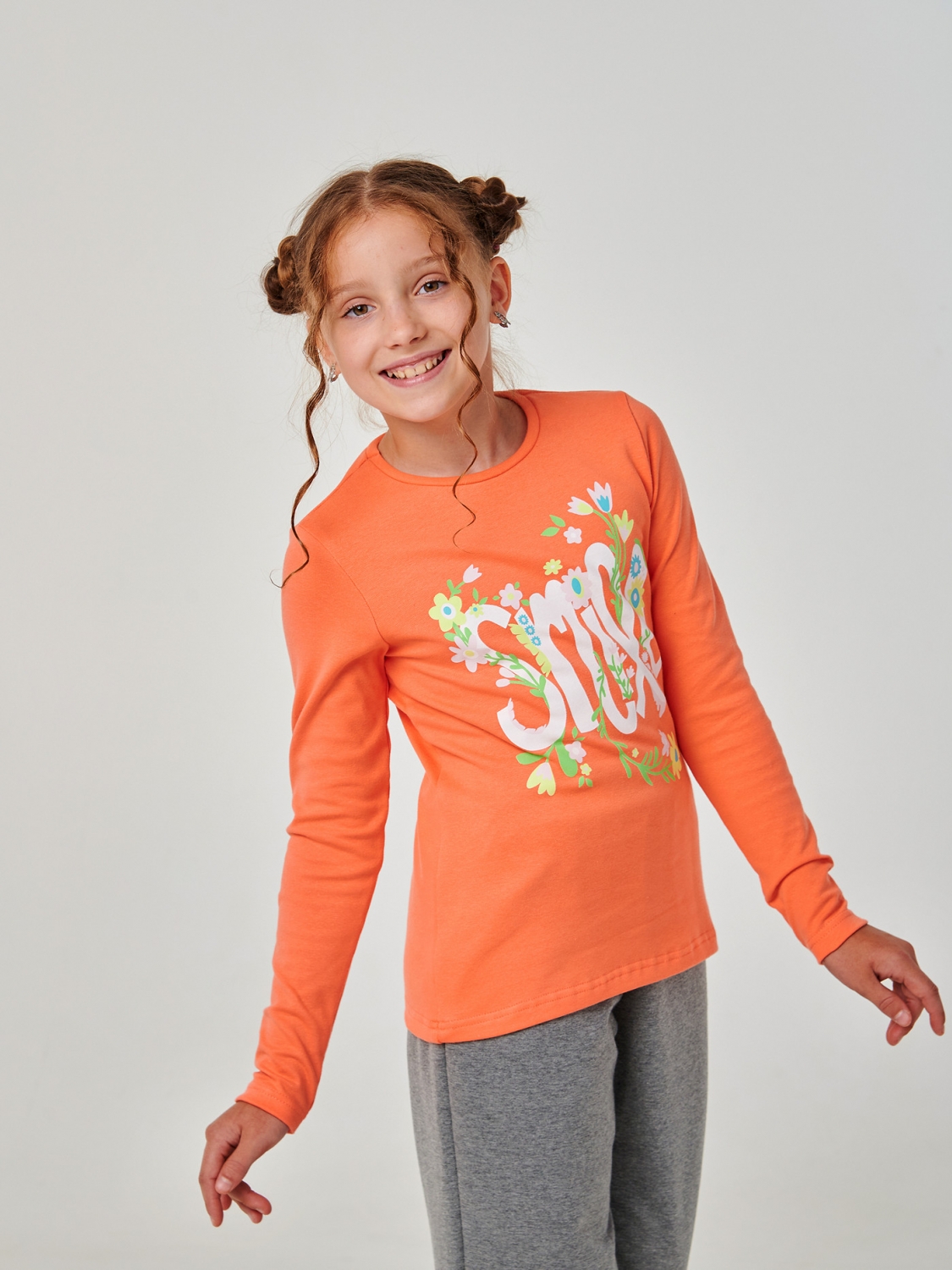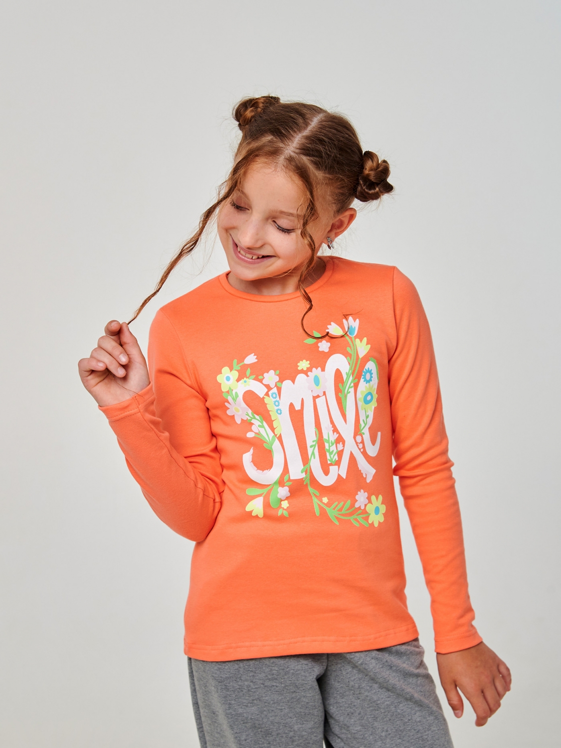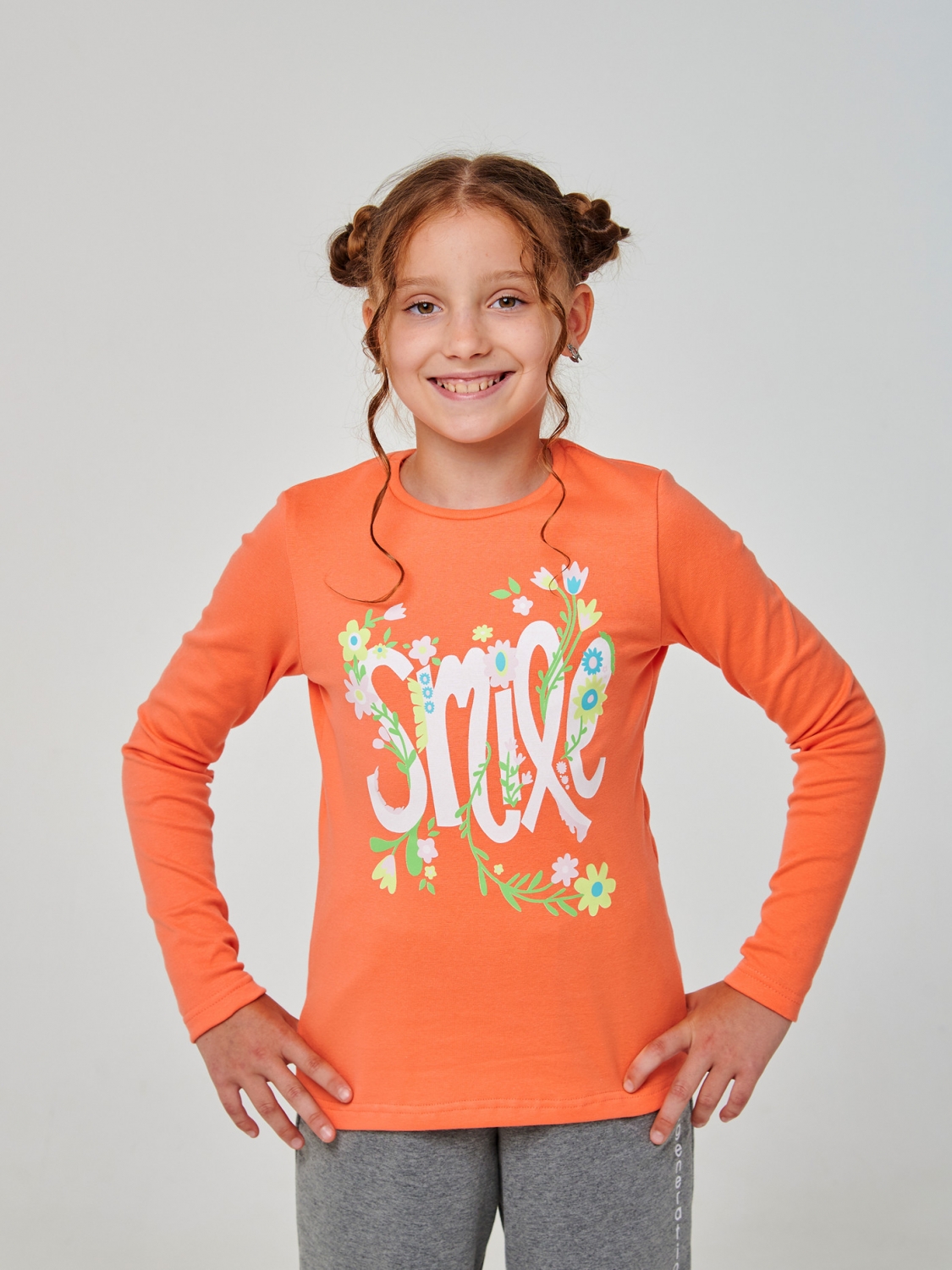 Футболка з довгим рукавом для дівчинки пошита із зручної стрейчевої гумки, яка гарантує неймовірну свободу руху та комфорт у будь-якій ситуації. Напис 'Smile', оточений ніжними квітами, надає цій футболці ніжності та позитивного настрою. Друк не тріскається і не знімається після прання, що гарантує довговічність та яскравість дизайну. Доступна в ніжних та яскравих кольорах. Футболка ідеально підходить для повсякденного носіння.