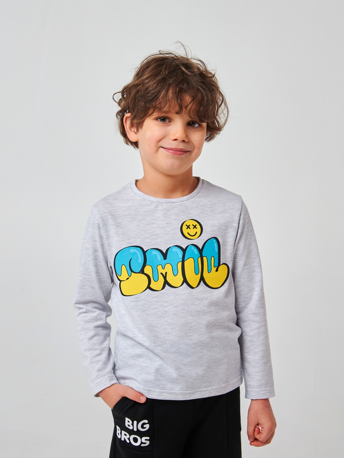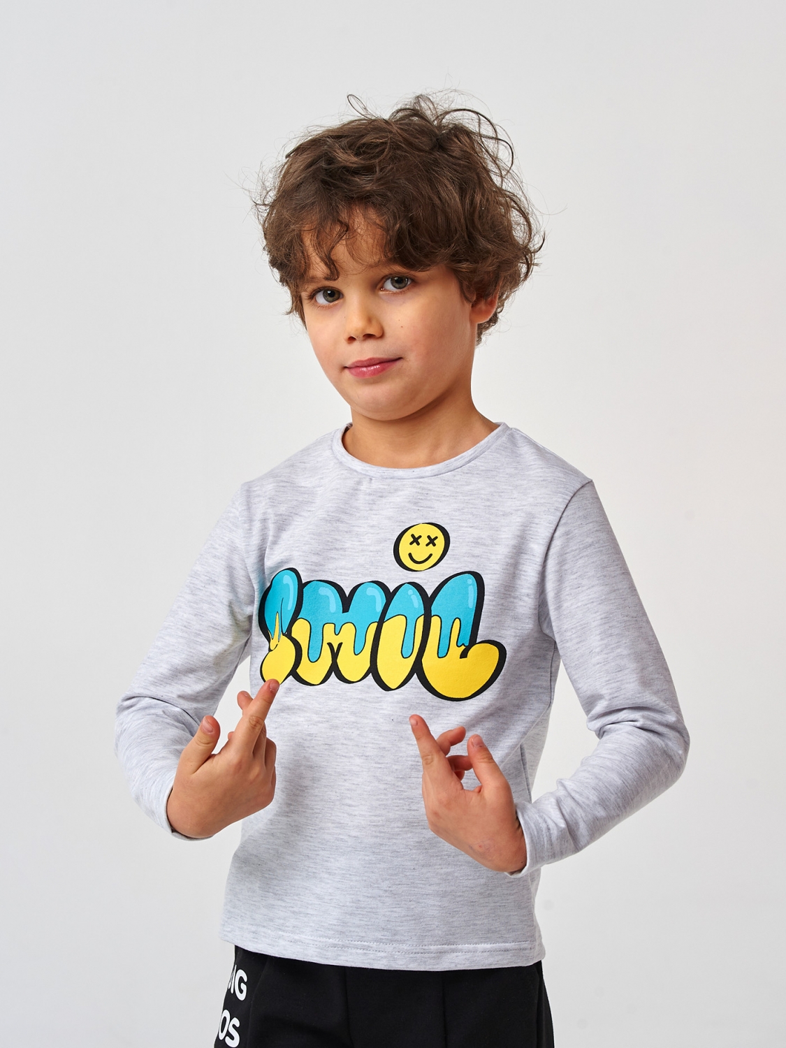 Виражай себе яскраво з нашою унікальною футболкою у кольорі сірий меланж із прямою печаткою "Smil" у стилі графіті. Енергійний смайлик додасть позитиву у кожний образ. Стрейчевий кулір забезпечує комфорт та свободу руху, що ідеально підходить для активних дітей.