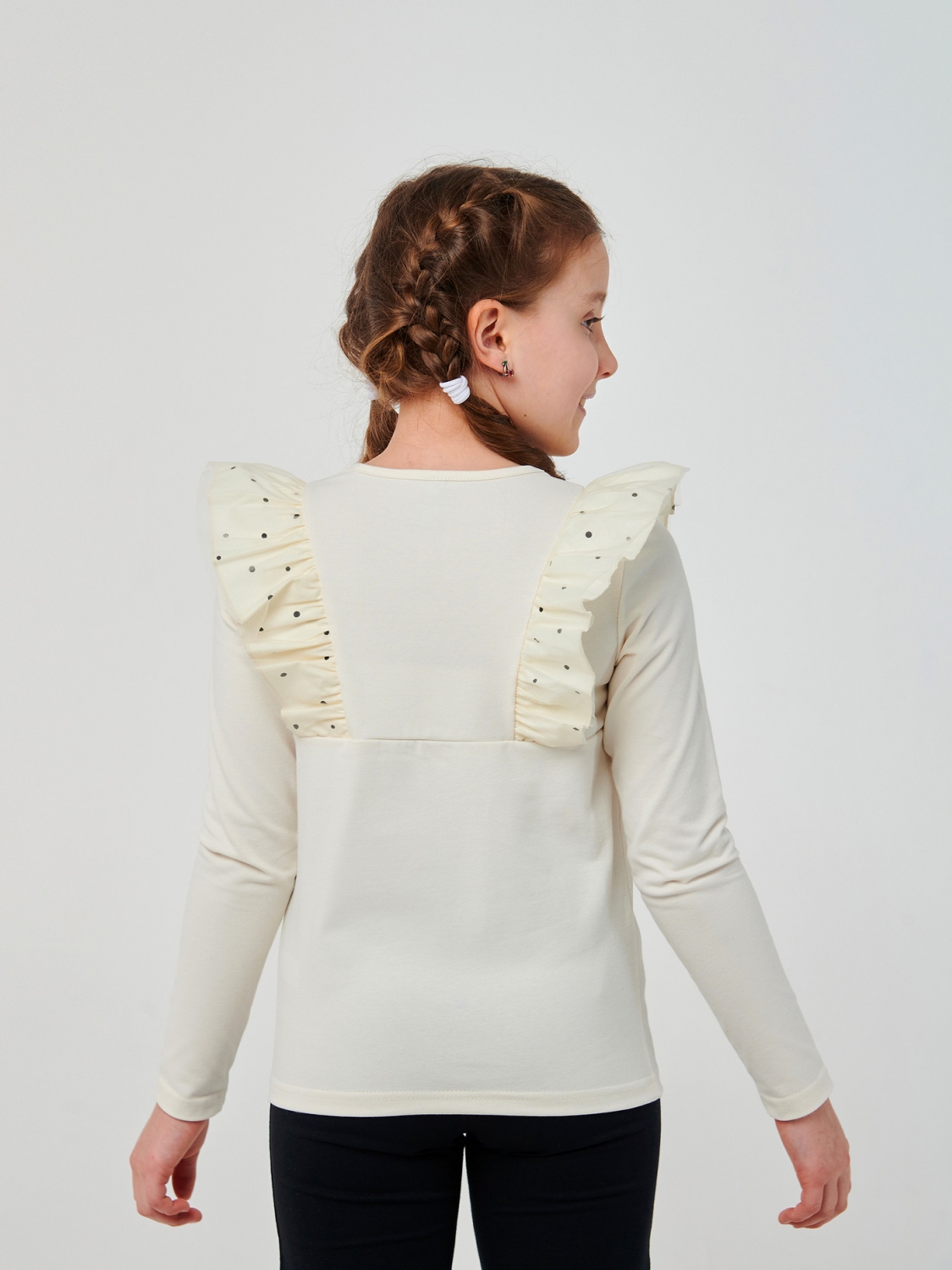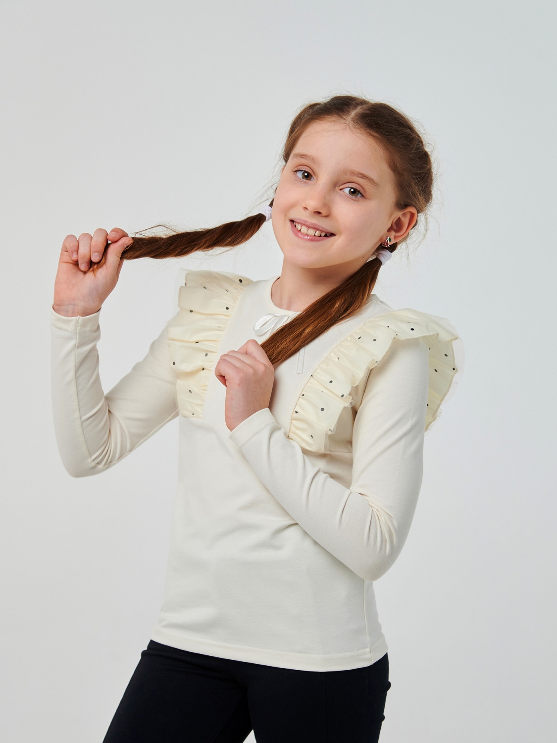 Ніжність та стиль в одному! Чудова молочна блузка для дівчаток з довгим рукавом, прикрашена вишуканими мереживами з фатину та тканини у горошок. Вона стане справжньою окрасою гардеробу вашої маленької модниці. Блузка пошита з високоякісного бавовняного полотна стрейчевого куліра, забезпечуючи м'якість та комфорт при кожному носінні. Вона ідеально підходить для школи та повсякденних занять, не сковуючи рухів. Фатін створює чудовий прозорий ефект, мереживні деталі додають вишуканості та романтики, а атласний бантик стає завершальним штрихом, надаючи образу ніжності та чарівності.