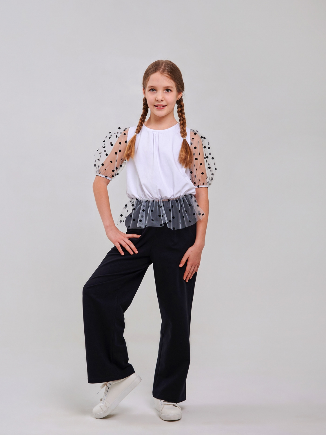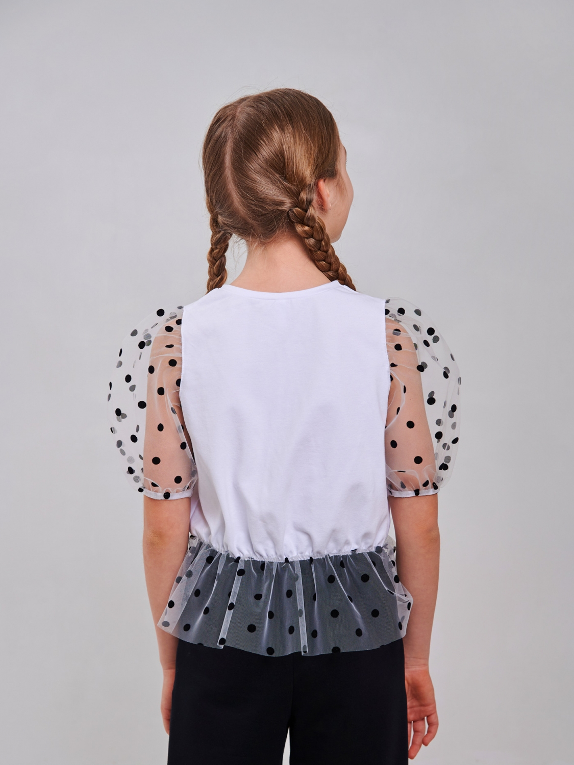 Чарівна блуза для дівчинки - ідеальний вибір для маленької модниці! Стрейчевий кулір – м'якість, комфорт та свобода рухів. Ніжна сітка у горошок – вишуканий акцент для стильного образу. Короткий рукав – ідеальний для теплих днів та яскравих вражень! Нехай ваша дівчинка сяє щодня!