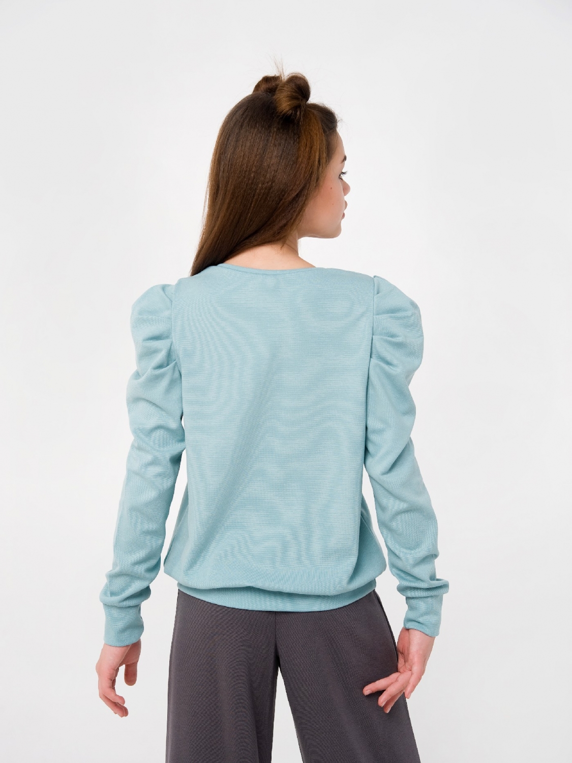 Практичний та мінімалістичний сіро-зелений світшот підійде дівчаткам віком від 7 до 16 років. Цей виріб виконаний з приємного до тіла та міцного матеріалу – пунто ді рома, який не викликає алергію. Світшот із довгими рукавами-ліхтариками оснащений резинками-манжетами. Школярка зможе носити його разом зі спідницями, шортами, штанами та джинсами в холодну пору року.