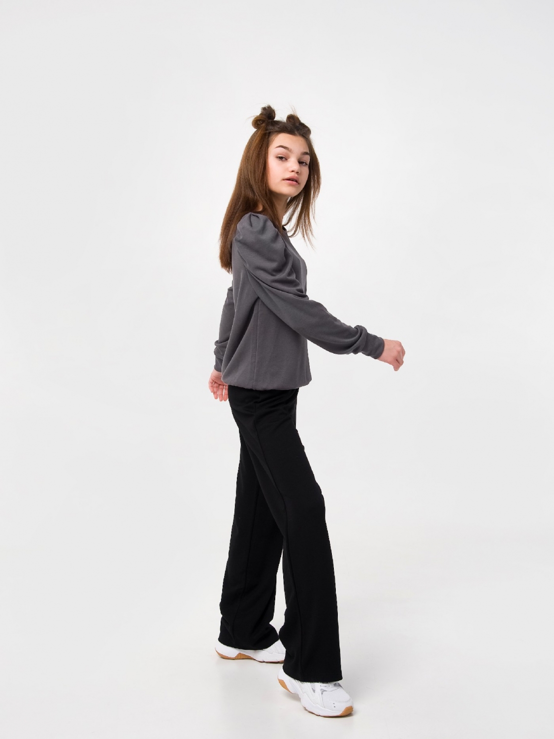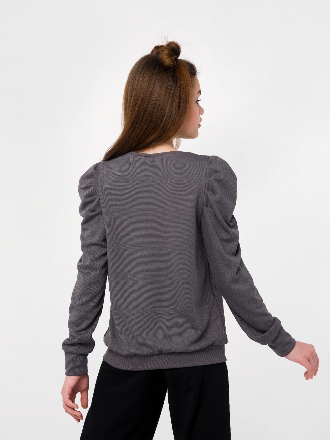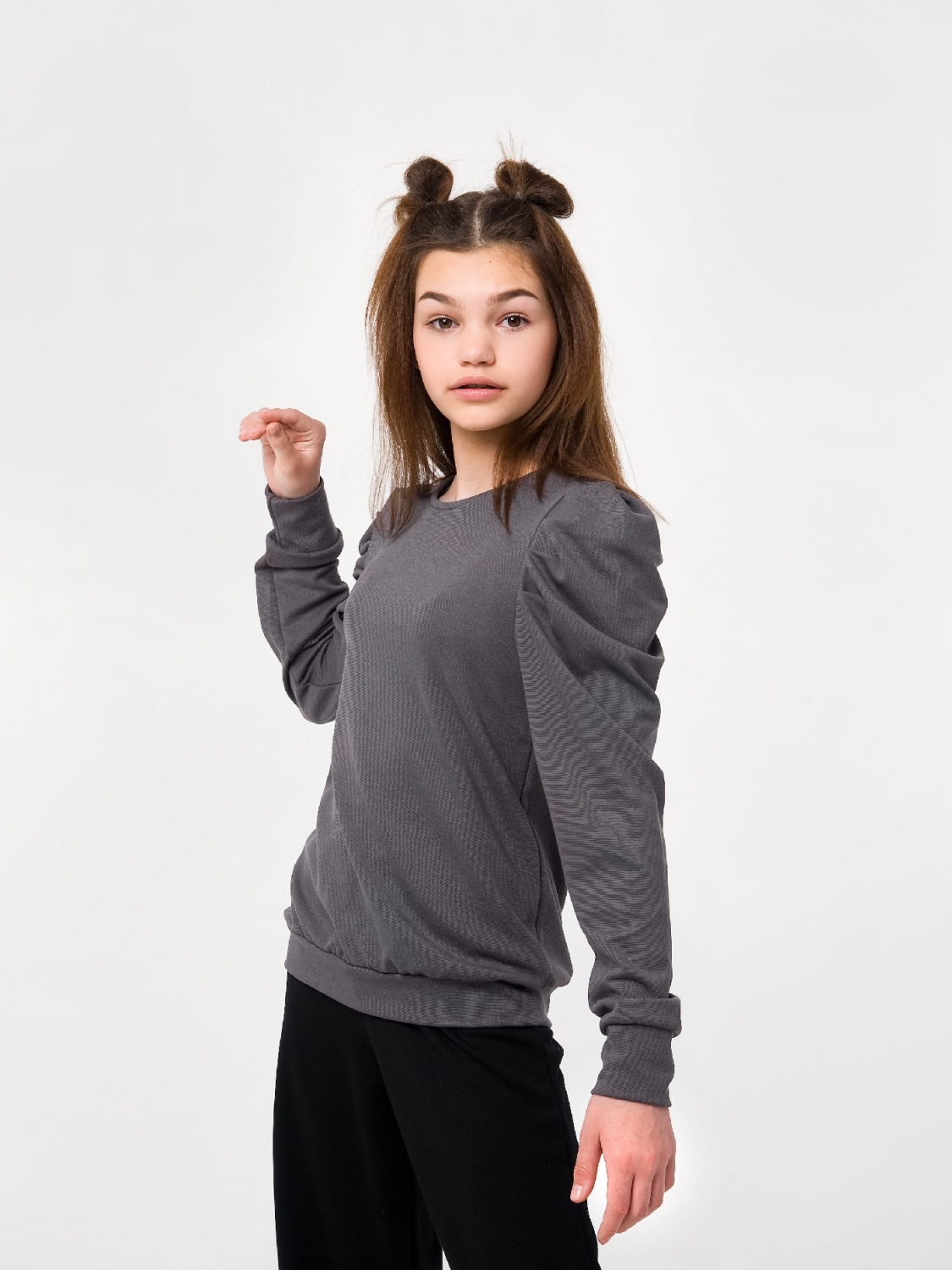 Простий та зручний у носінні сірий світшот для школярок у віці 7-16 років. Цей виріб не сковує руху і добре поєднується з іншим одягом, наприклад, брюками чи спідницями. Для пошиття використовувався якісний та приємний до тіла матеріал – пунто ді рома. Світшот із довгими рукавами-ліхтариками оснащений резинками-манжетами.