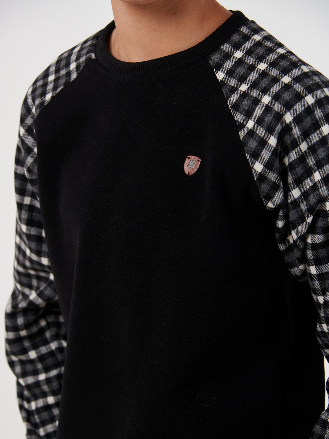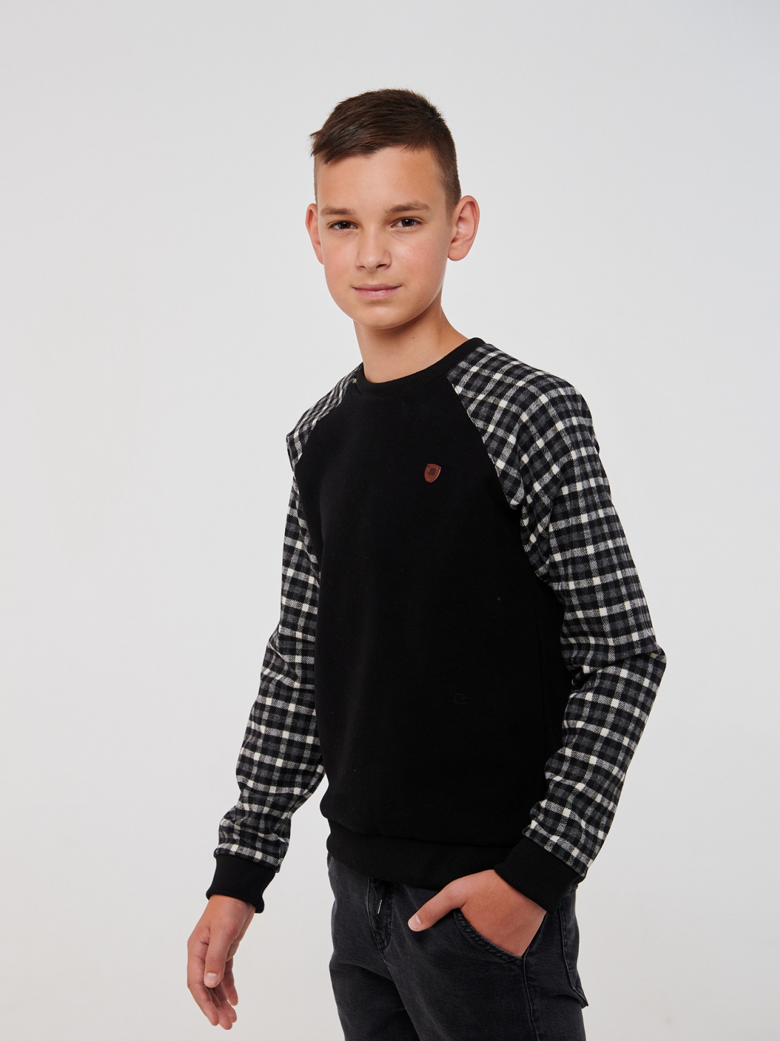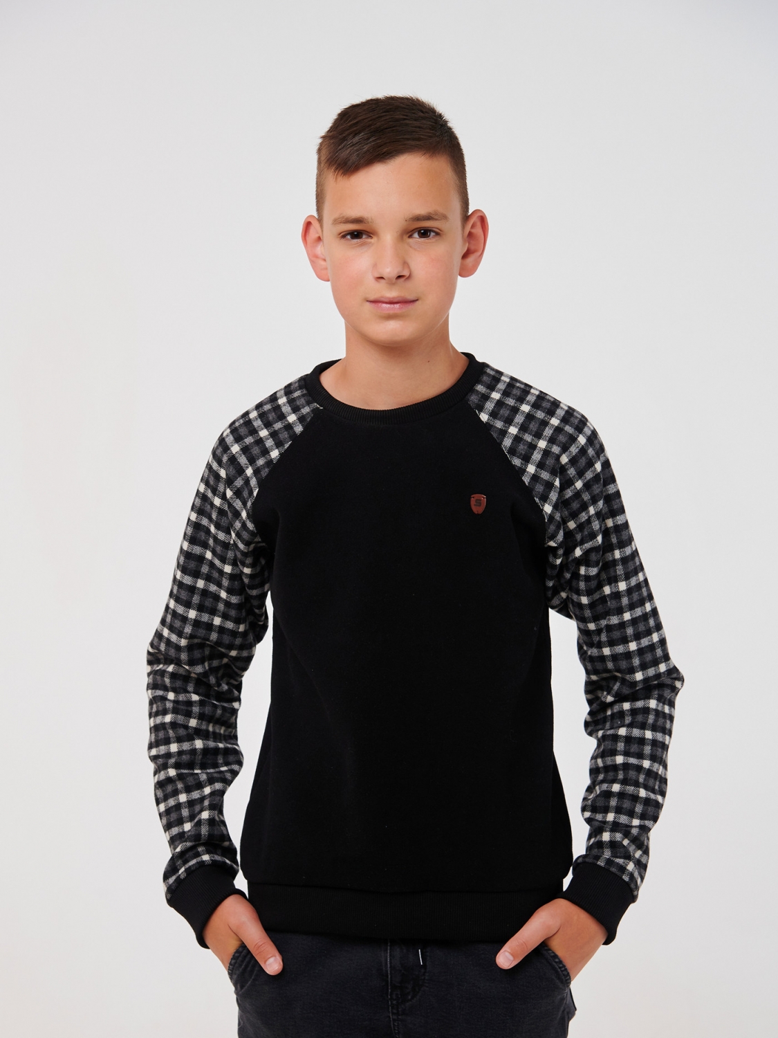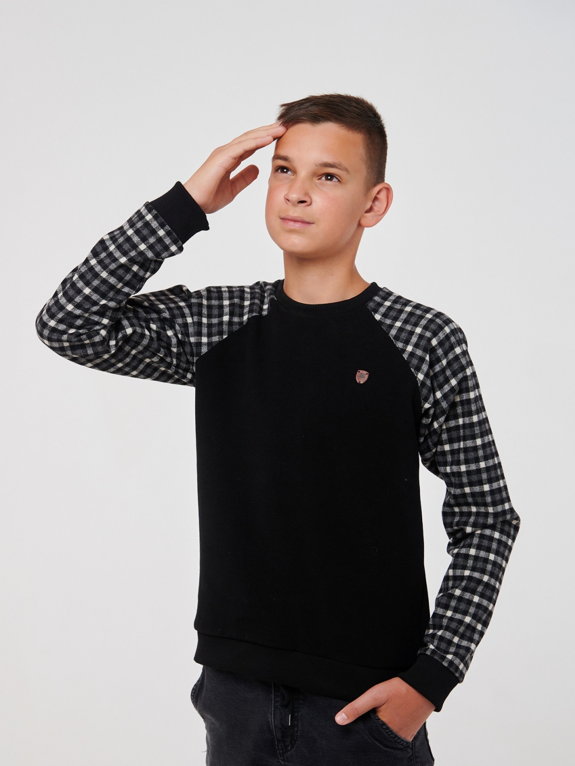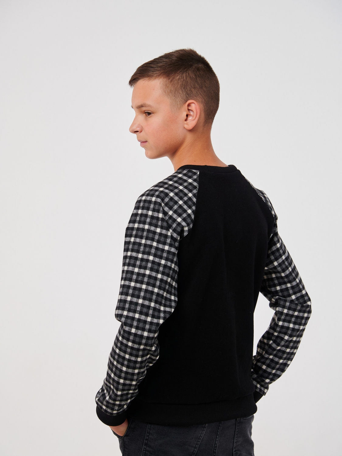 Стильний та зручний пуловер для справжнього модника! Чорно-біла клітка у поєднанні з м'яким полотном селяника створюють елегантний образ для хлопчика будь-якого віку. Селяник зігріє у холодні дні та стане чудовим доповненням до повсякденного гардеробу. Добре поєднується з джинсами чи брюками. Манжети на резинці. Шкіряна нашивка. Зробіть крок у бік стилю та комфорту з нашим чорним пуловером!