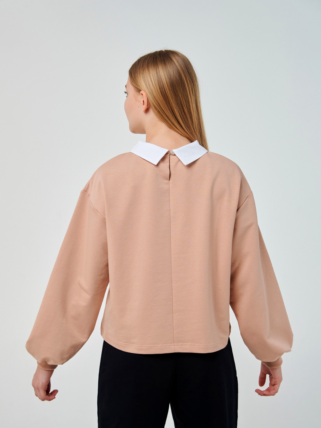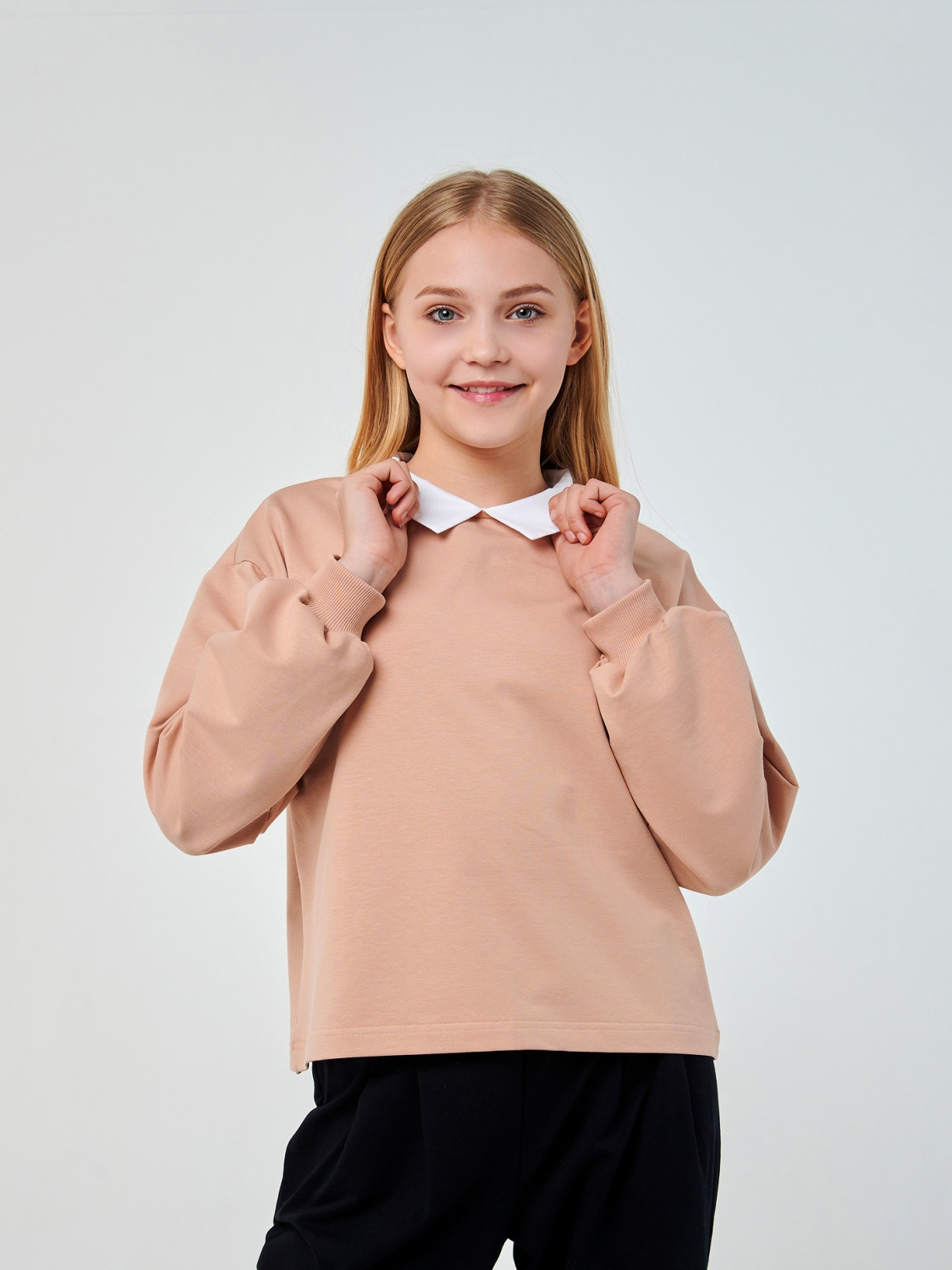 Світшот у стильному бежевому кольорі. Модель оверсайз надає йому сучасного і стильного вигляду, дозволяючи вільно рухатися і виявляти свою індивідуальність. Оригінальні широкі рукави додають цьому світшоту унікальності та стилю, привертаючи захоплені погляди. Білий тканинний комір створює вишуканий контраст і надає світшоту ділового вигляду. Поєднання якісного полотна та оригінального дизайну робить цей світ ідеальним вибором для повсякденного використання. Будь то школа або прогулянка з друзями, ваша дівчинка виглядатиме стильно і почуватиметься комфортно у будь-якій ситуації.