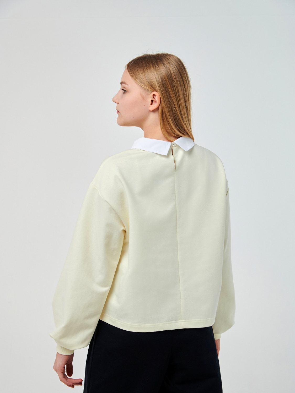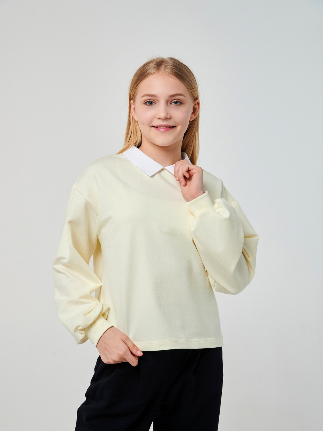 Світшот у ніжному кремовому кольорі. Модель оверсайз надає йому сучасного і стильного вигляду, дозволяючи вільно рухатися і виявляти свою індивідуальність. Оригінальні широкі рукави додають цьому світшоту унікальності та стилю, привертаючи захоплені погляди. Білий тканинний комір створює вишуканий контраст і надає світшоту ділового вигляду. Поєднання якісного полотна та оригінального дизайну робить цей світ ідеальним вибором для повсякденного використання. Будь то школа або прогулянка з друзями, ваша дівчинка виглядатиме стильно і почуватиметься комфортно у будь-якій ситуації.