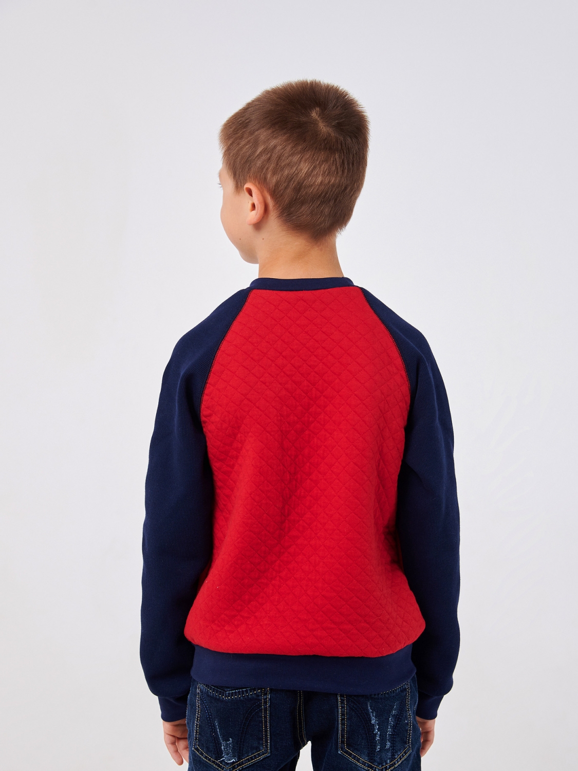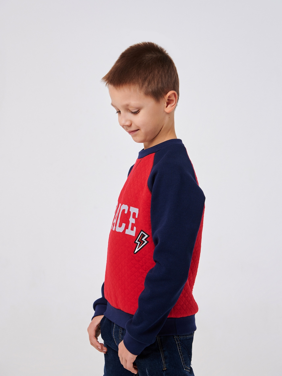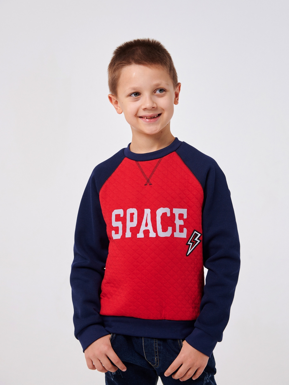 Унікальність цього пуловера підкреслюється стильною наклейкою "Space", що додає модний акцент і створює атмосферу пригод. Вона чудово поєднується з яскравим червоним кольором пуловера і робить його особливим. Сині рукави надають йому елегантного та модного вигляду, створюючи привабливий контраст. Пуловер ідеально підходить для повсякденного носіння, активних ігор та прогулянок.