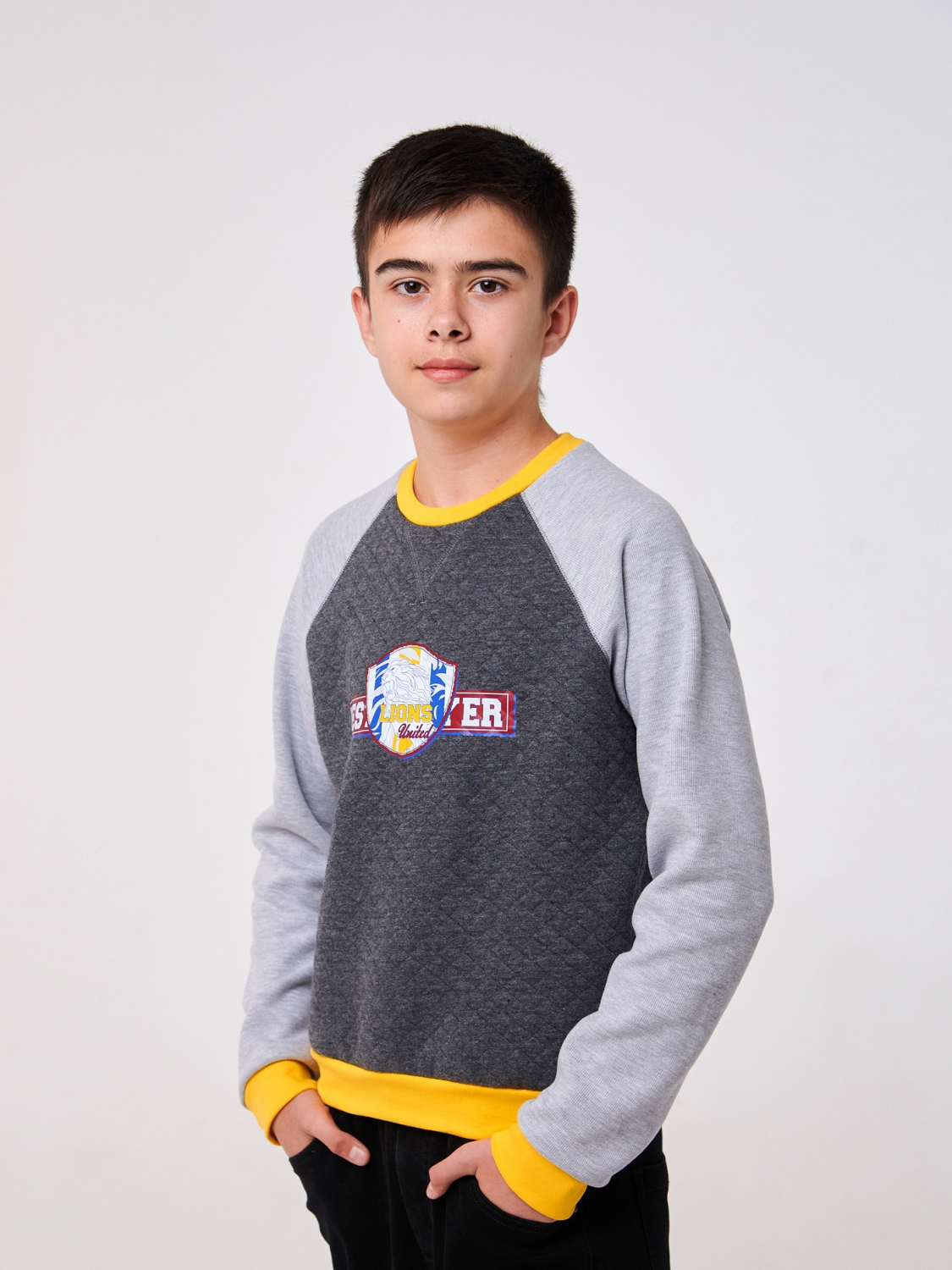 Пошитий з якісного теплого та м'якого полотна капітон, пуловер забезпечує максимальну теплоізоляцію та комфорт у холодні дні. Наклейка у вигляді лева на грудях додає унікальності та стилю образу вашого хлопчика. Манжети, воріт пуловера виконані у яскравому жовтому кольорі, створюючи контраст та підкреслюючи його стильний дизайн. Цей акцент надає пуловеру свіжого та сучасного вигляду, привертаючи погляди оточуючих. Ідеально підходить для активного відпочинку та прогулянок на свіжому повітрі.