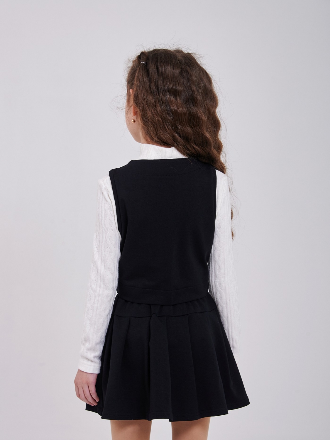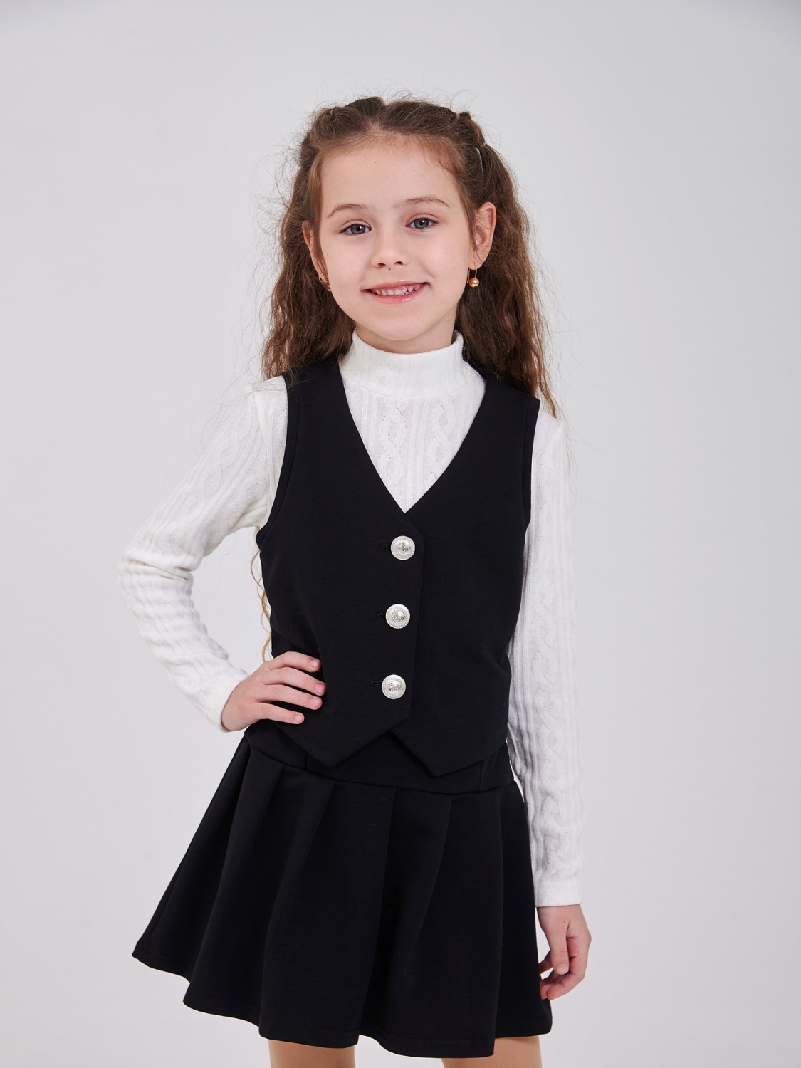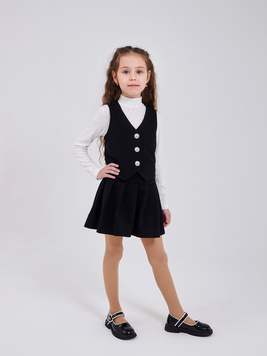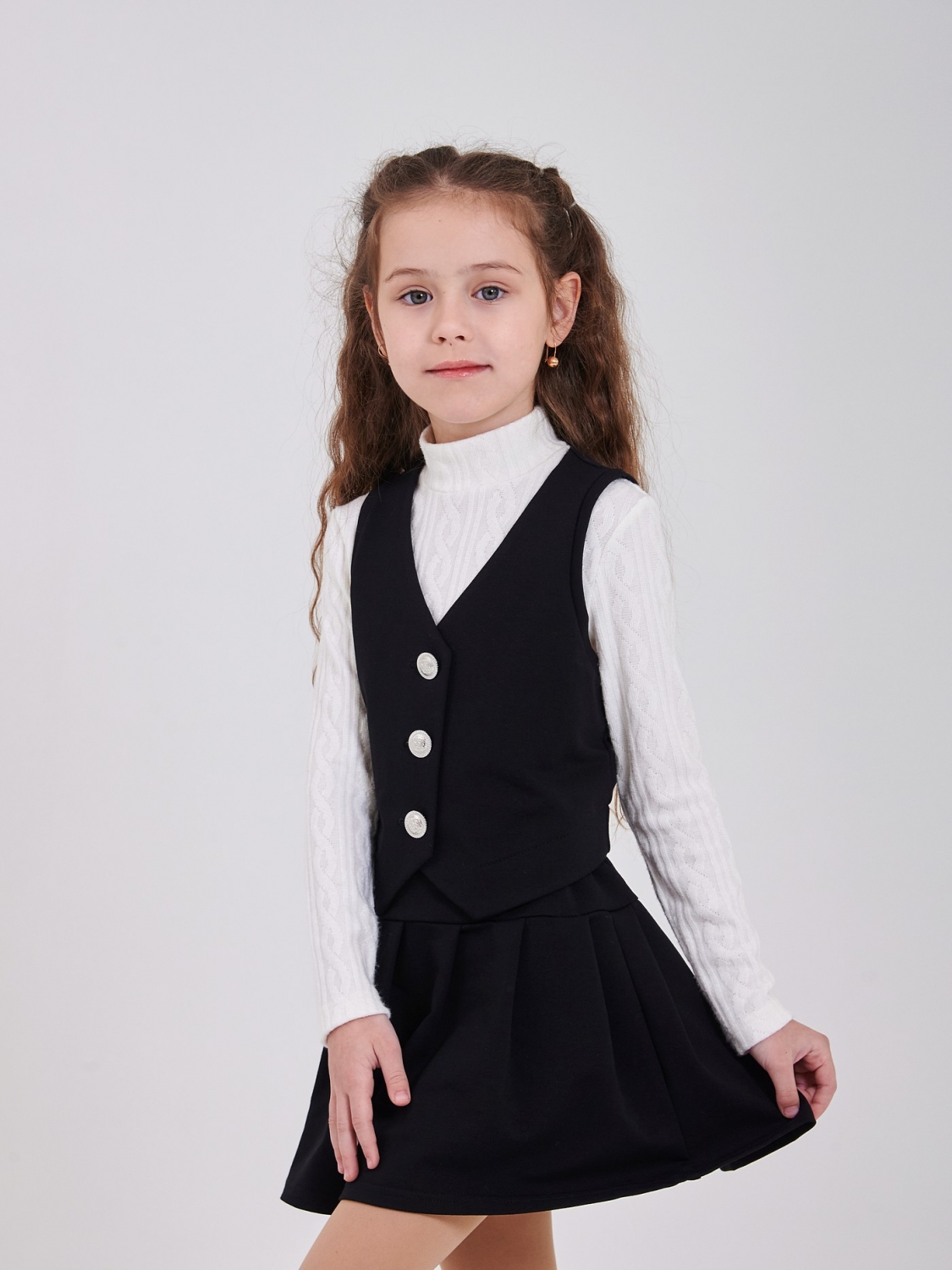 Класичний чорний жилет для дівчинки із сріблястими гудзиками ідеально доповнить шкільний образ. V-подібний виріз підкреслює акуратність. Полотно стрейчевий футер – м'яке та комфортне. Поєднується з блузками, гольфами, спідницями та брюками – універсальний елемент шкільного гардеробу!