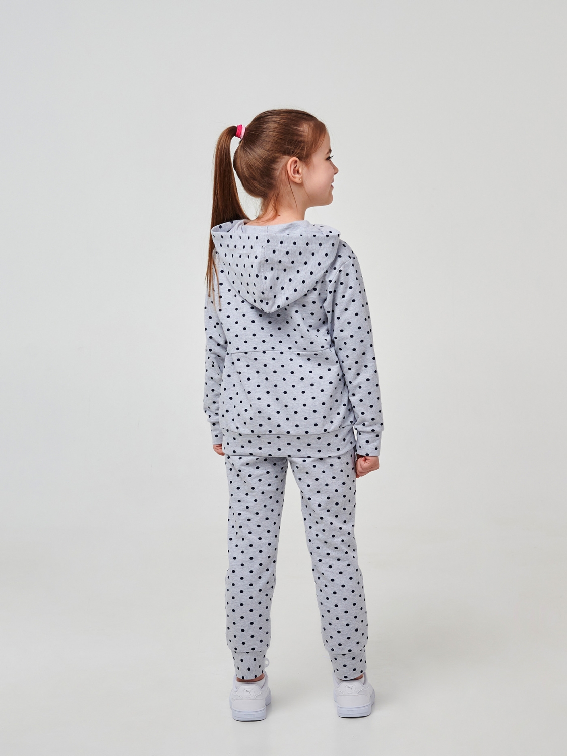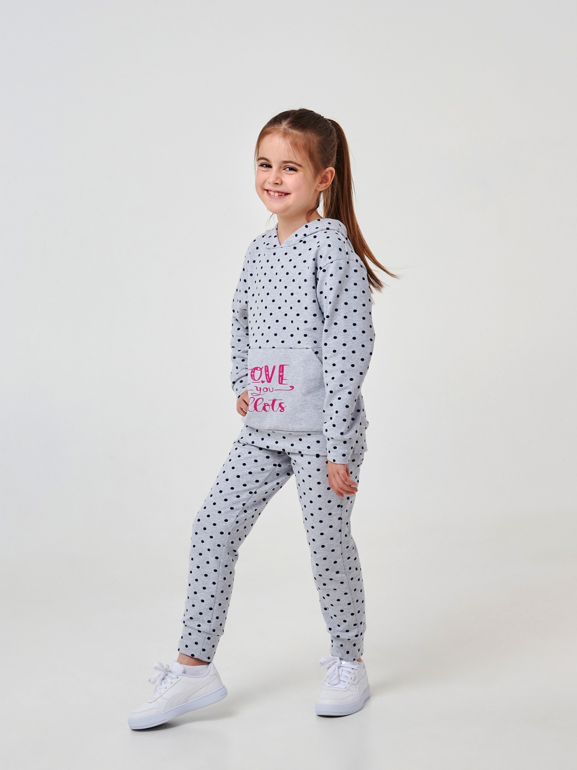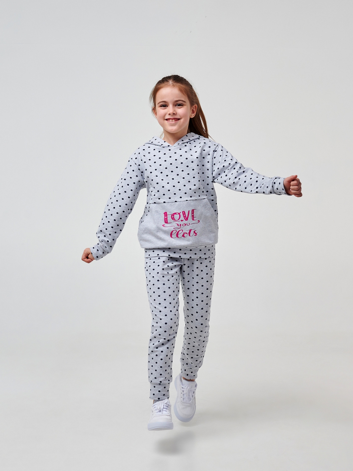 Ми пошили цей костюм з любов'ю до деталей, щоб ваша маленька принцеса відчувала себе справжньою модною зірочкою щодня. Костюм складається з стрейчевого футера – м'якого, еластичного бавовняного полотна, що забезпечує свободу рухів та зручність носіння. Сучасна толстовка з капюшоном та кишенею кенгуру стане незамінною на прогулянках та заняттях спортом, а також додасть затишку у прохолодні вечори. Але головну увагу приділяємо стильним деталям! Цей костюм прикрашений красивою наклейкою, що створює неповторний акцент і надає образу грайливий шарм. Модний колір сірий меланж у горошок – яскравий та стильний дизайн, який підійде для найрізноманітніших заходів!