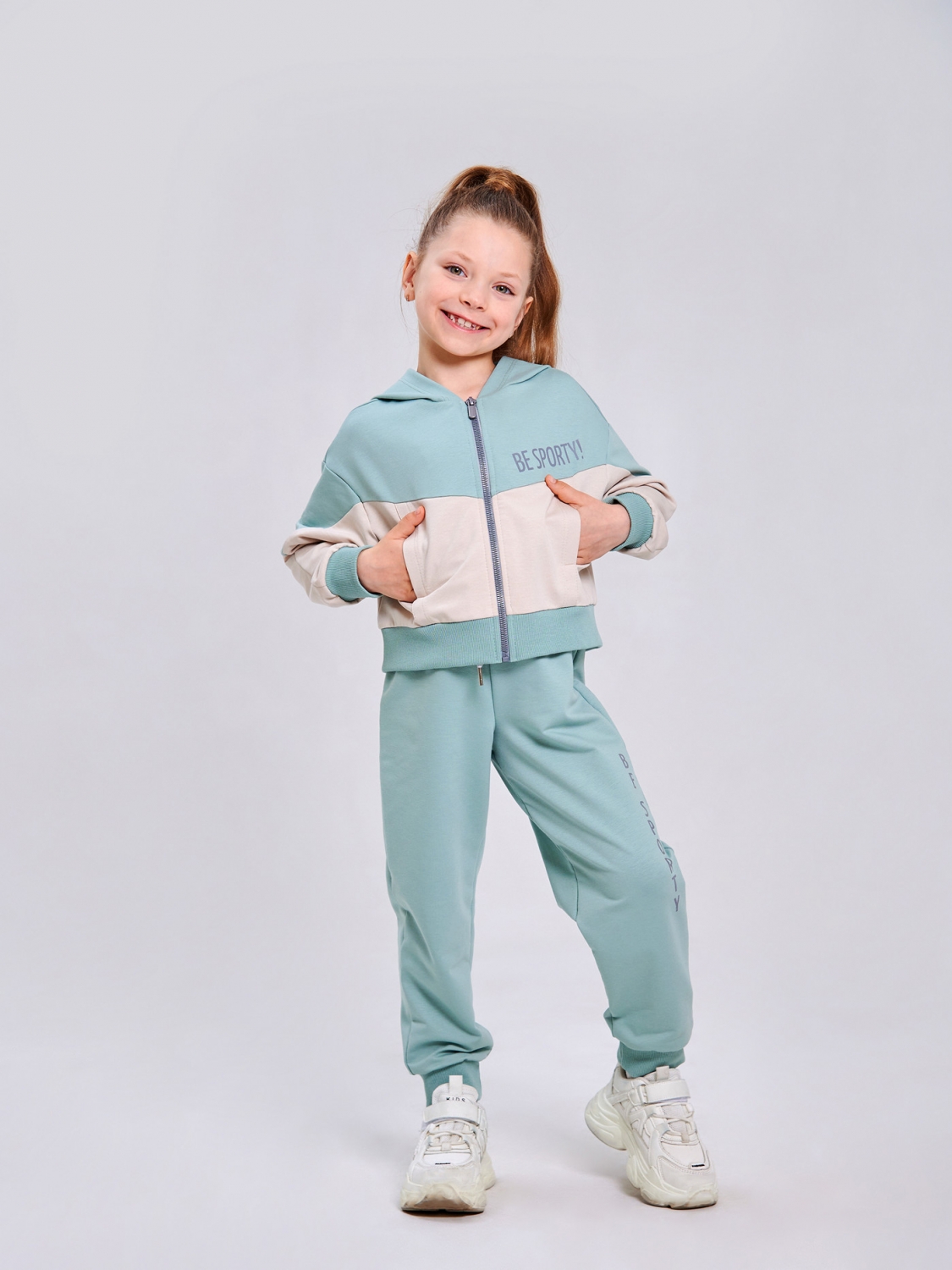 Додайте в гардероб своєї дівчинки стильний та зручний спортивний костюм у кольорі світлого хакі з бежевим! Куртка з блискавкою та капюшоном, кишені для зручності та шнурок на поясі штанів забезпечують ідеальну посадку та практичність. Наклейка Be Sporty додає яскравий акцент. Костюм виконаний із стрейчевого футера, що дарує максимальну свободу рухів.