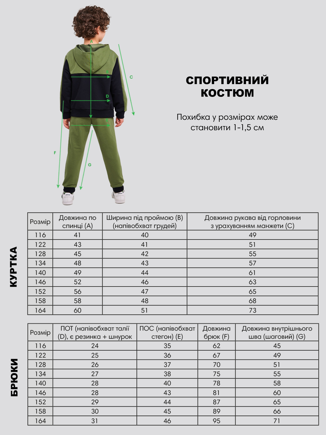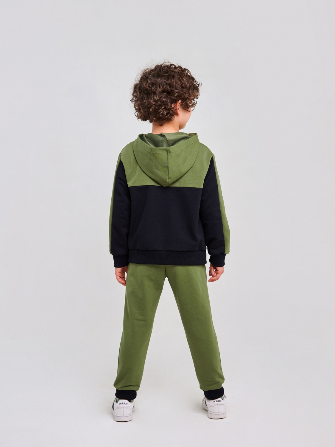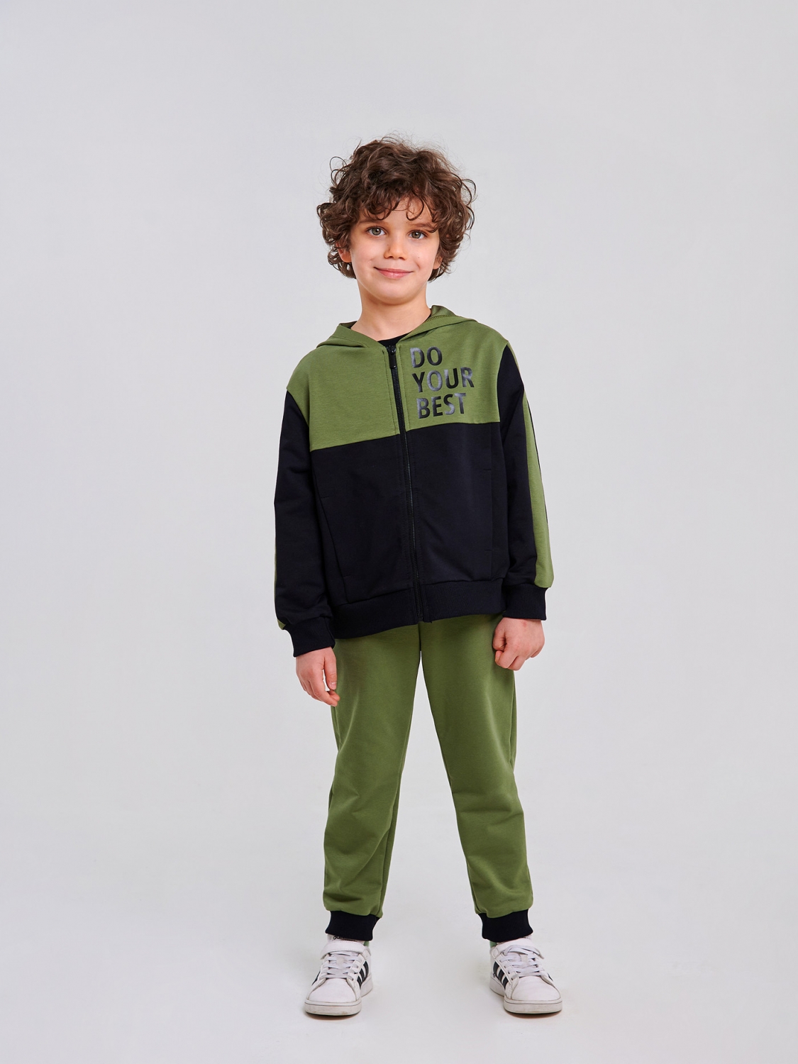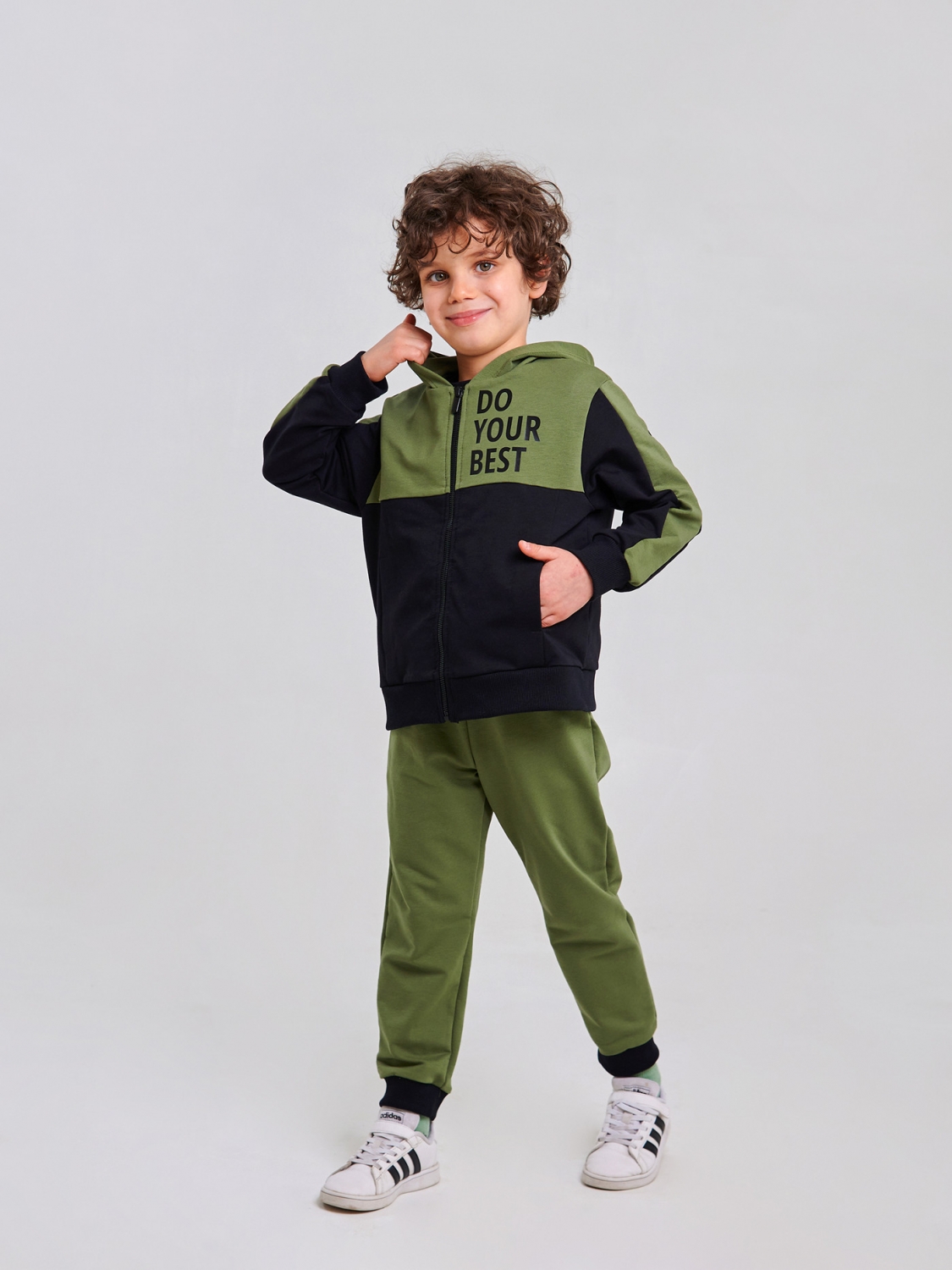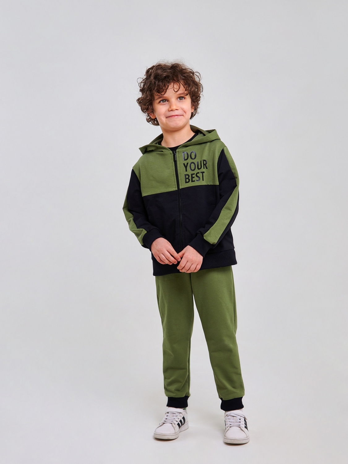 Ідеальний вибір для активного та цілеспрямованого хлопчика – це наш спортивний костюм у кольорі хакі з чорним! Куртка з блискавкою та капюшоном, зручні кишені та шнурок на поясі штанів забезпечують максимальний комфорт та практичність. Наклейка "Do Your Best" мотивує досягнення кращих результатів. Пошитий із стрейчевого футера, костюм дарує свободу рухів та затишок.