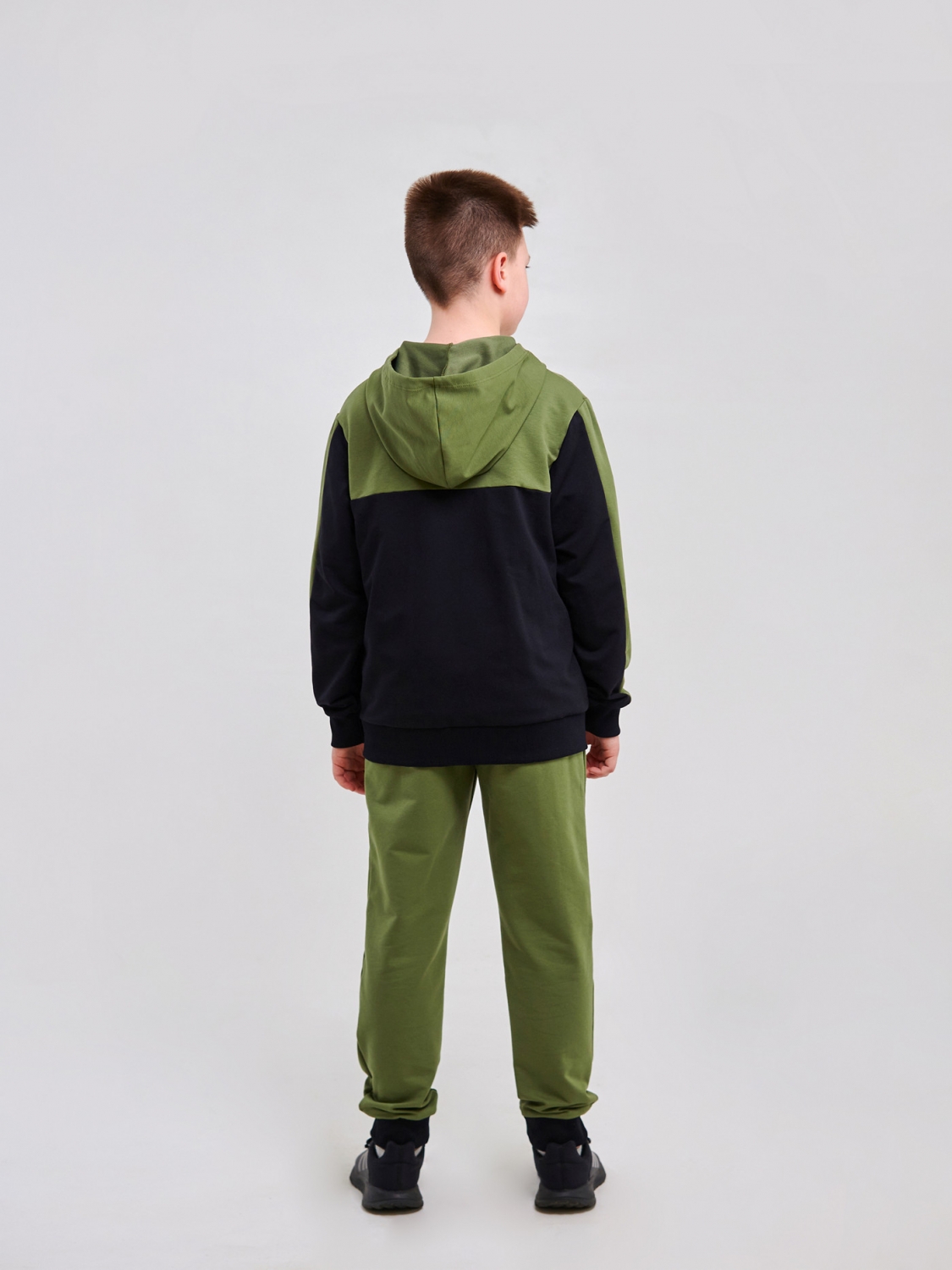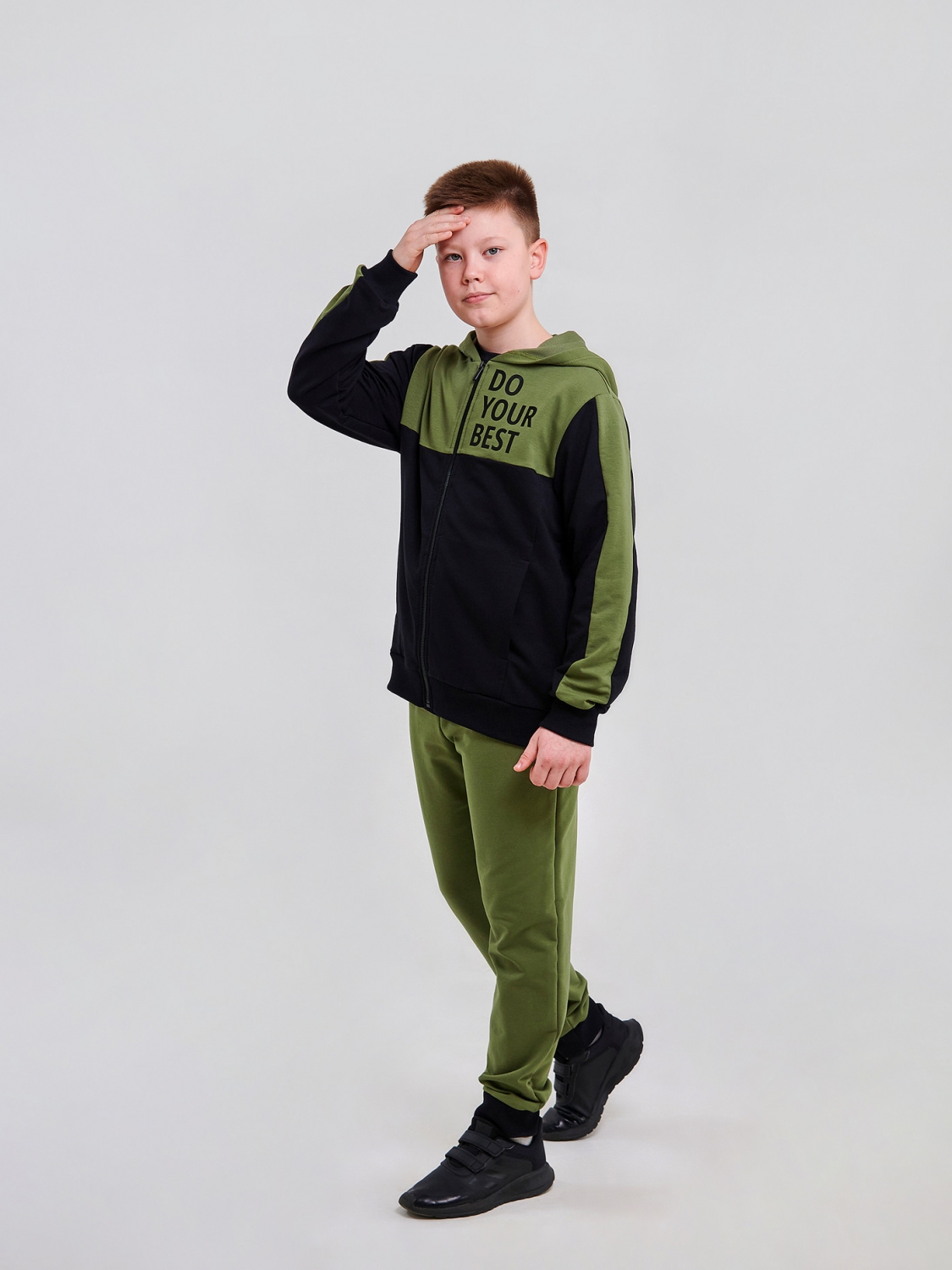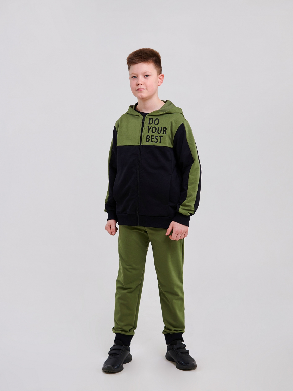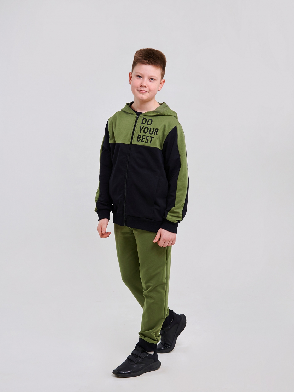 Ідеальний вибір для активного та цілеспрямованого хлопчика – це наш спортивний костюм у кольорі хакі з чорним! Куртка з блискавкою та капюшоном, зручні кишені та шнурок на поясі штанів забезпечують максимальний комфорт та практичність. Наклейка "Do Your Best" мотивує досягнення кращих результатів. Пошитий із стрейчевого футера, костюм дарує свободу рухів та затишок.