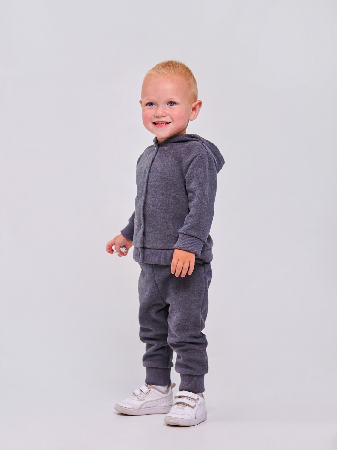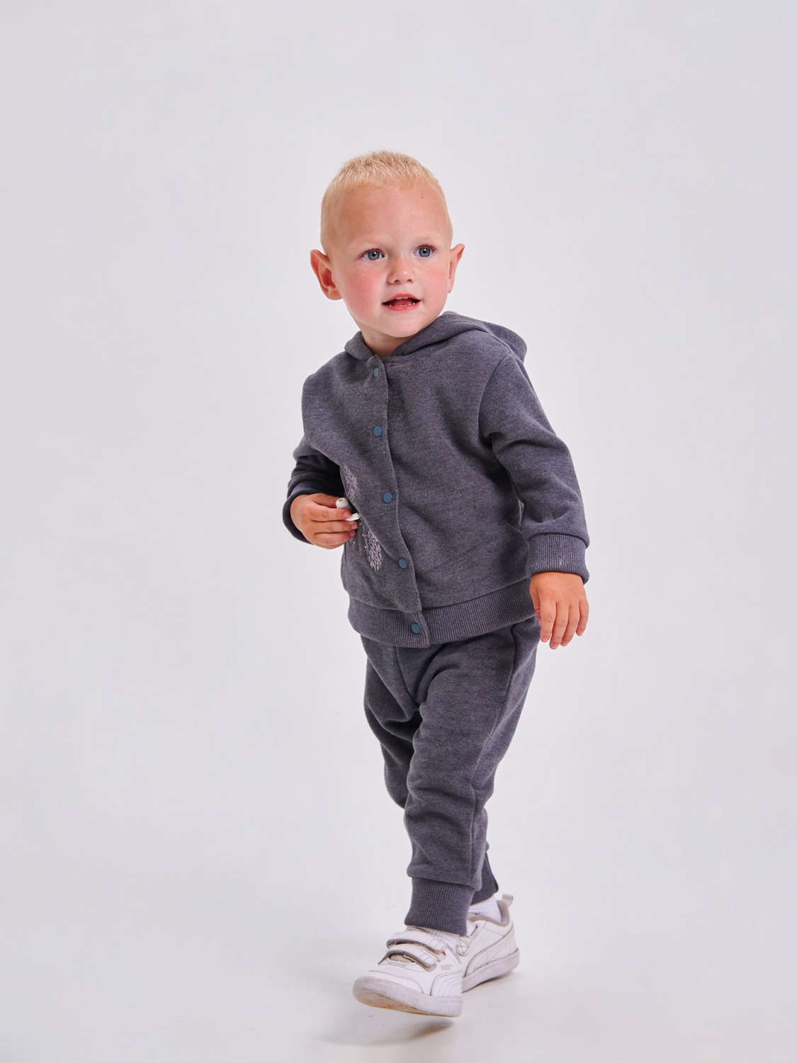 Теплий костюм для малюків у графітовому кольорі – стиль та комфорт в одному! Пошитий із м'якого полотна селяник, цей костюм забезпечить тепло та зручність у холодні дні. Кнопки та манжети роблять його практичним для щоденного використання, а ніжна вишивка із зображенням їжачків додає милий та забавний акцент. Ідеальний вибір для затишних прогулянок та ігор!