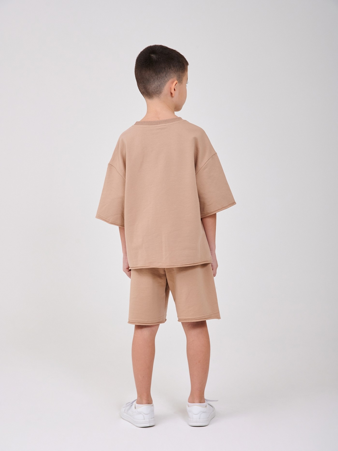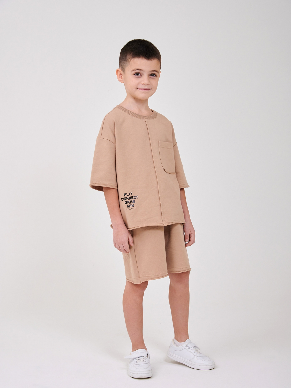 Стильний костюм для хлопчика зі стрейчевого футера двонитки - відмінний вибір для активних та сучасних дітей! М'яке та приємне до тіла полотно добре тягнеться, не сковує руху та забезпечує комфорт протягом усього дня. Вільна футболка з коротким рукавом і акуратною кишенею виглядає модно і сучасно, а шорти зручної довжини відмінно підходять для прогулянок, ігор та повсякденного носіння. Нейтральний бежевий колір легко поєднується з будь-яким взуттям та аксесуарами, створюючи стильний та акуратний образ. Практичний, зручний та стильний комплект, який стане чудовим варіантом на кожен день!