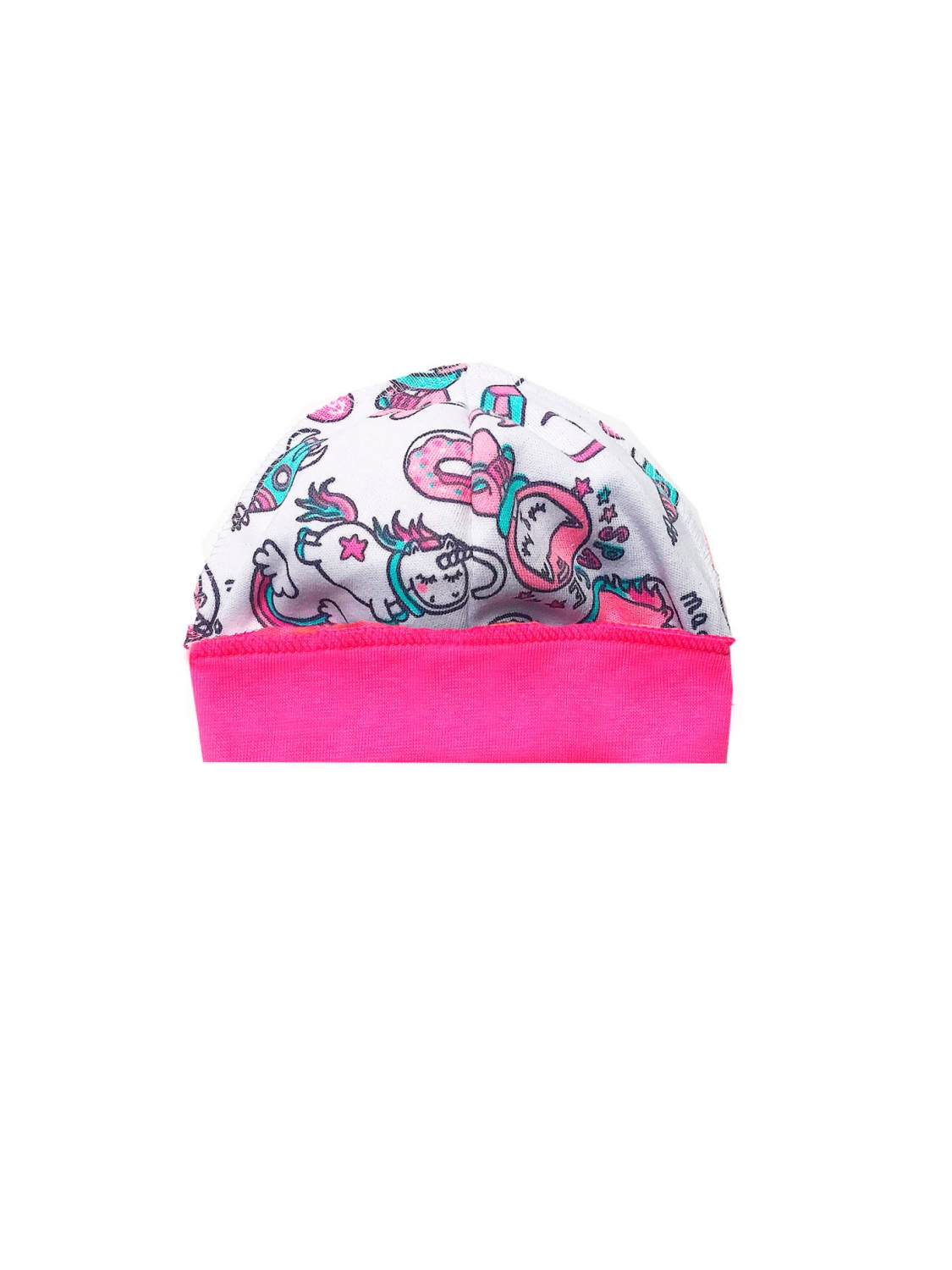 Мила стильна шапочка з прінтована тканини сподобається всім малятам. Для пошиття цього виробу використовувався якісний, приємний на дотик інтерлок, який не викликає алергію і добре зберігає тепло. Надійну фіксацію на голові забезпечує еластична гумка яскраво-рожевого кольору. Шапочку можна носити кожен день, поєднуючи її з кофтами, боді, сорочечки
