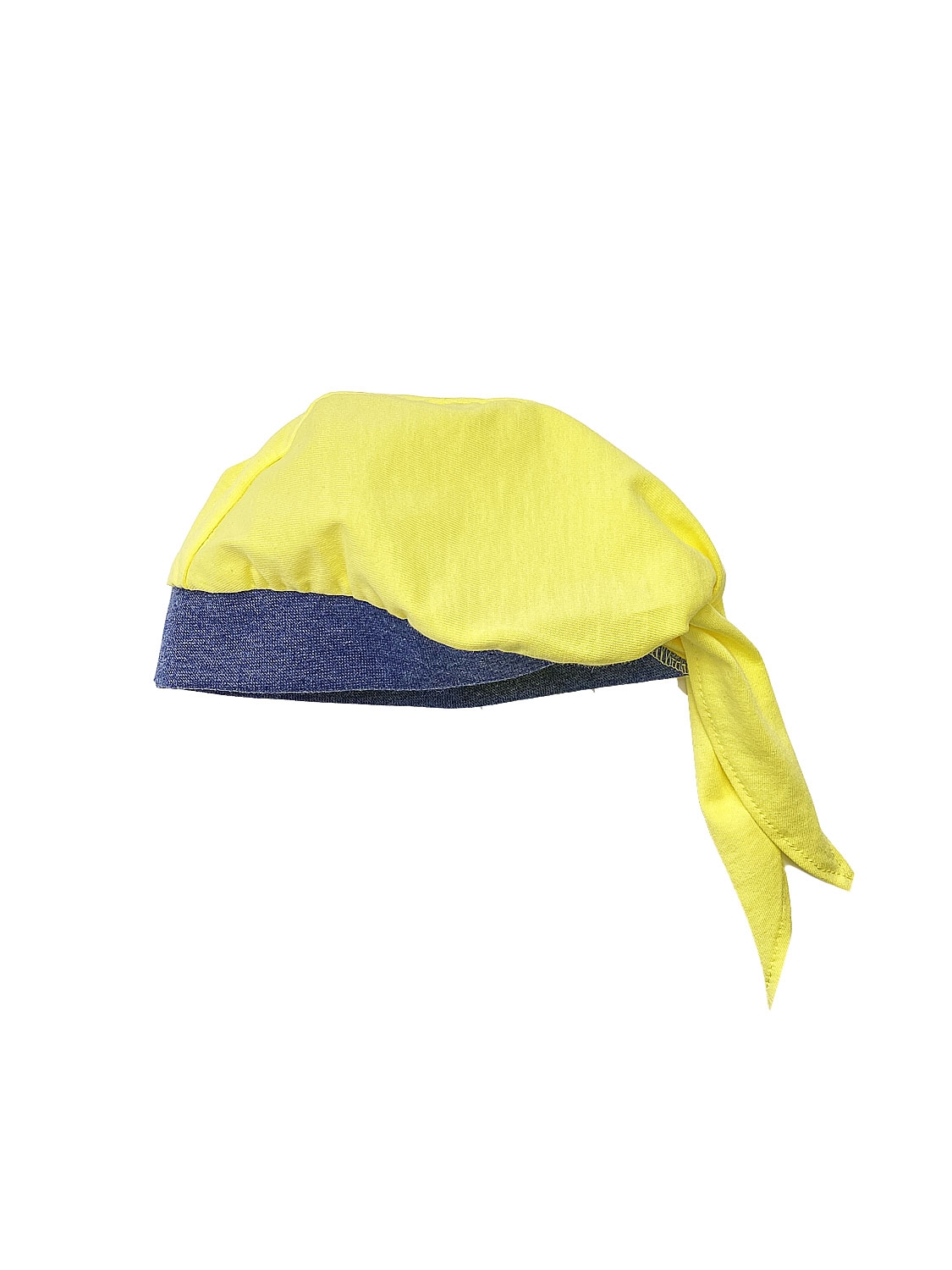 Жовта бандана захистить голову дитині від ультрафіолету в спекотну літню погоду. Модель комфортна в носінні завдяки широкому обідку і можливості зав'язати її ззаду на вузол. У пошитті використаний м'який кулир.