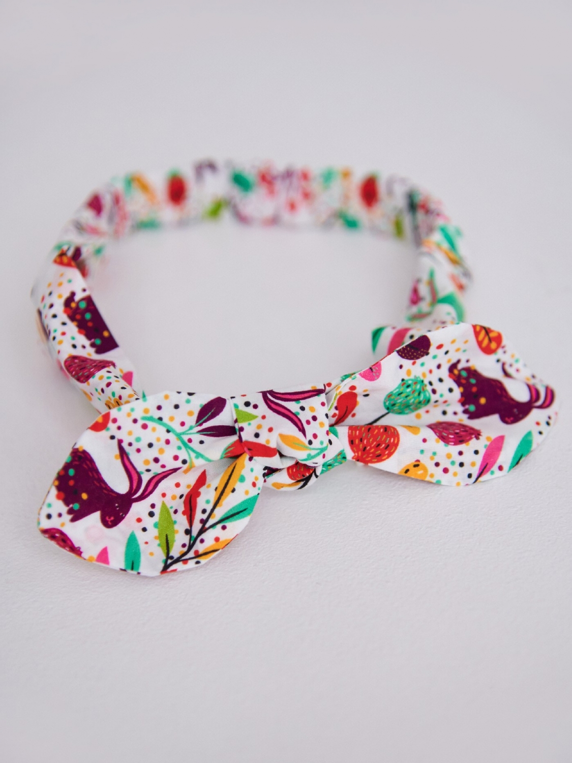 Пов'язка для дівчинки в веселий принт. Модель пошита із ситцю, бавовняного матеріалу, який добре пропускає повітря, вбирає вологу. На голові аксесуар фіксується за допомогою резинки. У пов'язці дівчинці буде комфортно, вона не тисне, не натирає. Її можна поєднувати із сукнями, сарафанами, кофтинками.