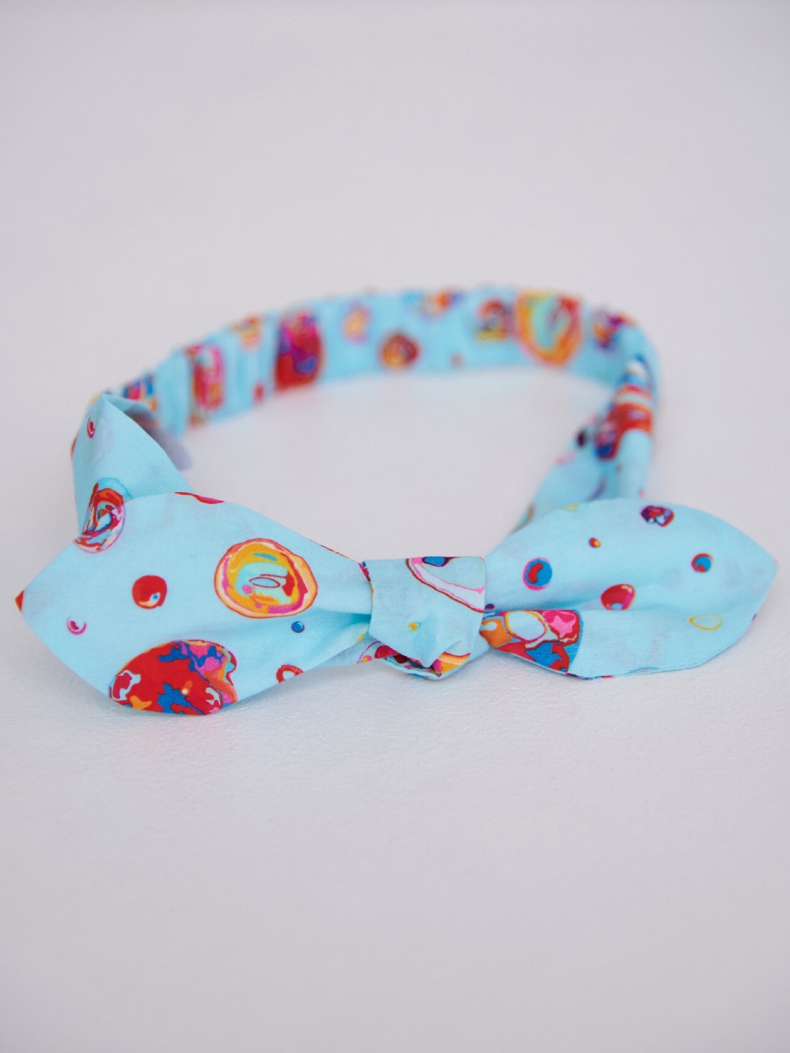Пов'язка з бантиком для дівчинки, пошитий із ситця. Аксесуар надійно фіксується на голові дитини за допомогою резинки. При цьому він не тисне і не натирає. Виріб у принт бульбашки можна комбінувати з футболками, сарафанами, сукнями.
