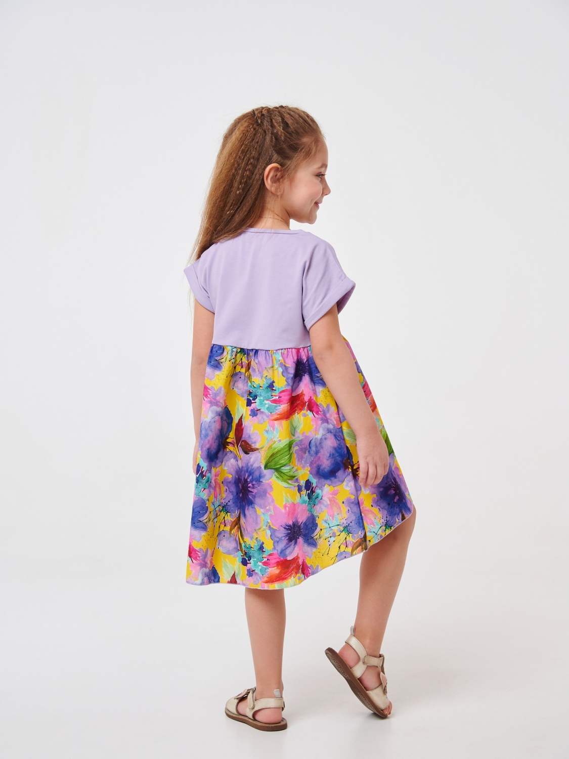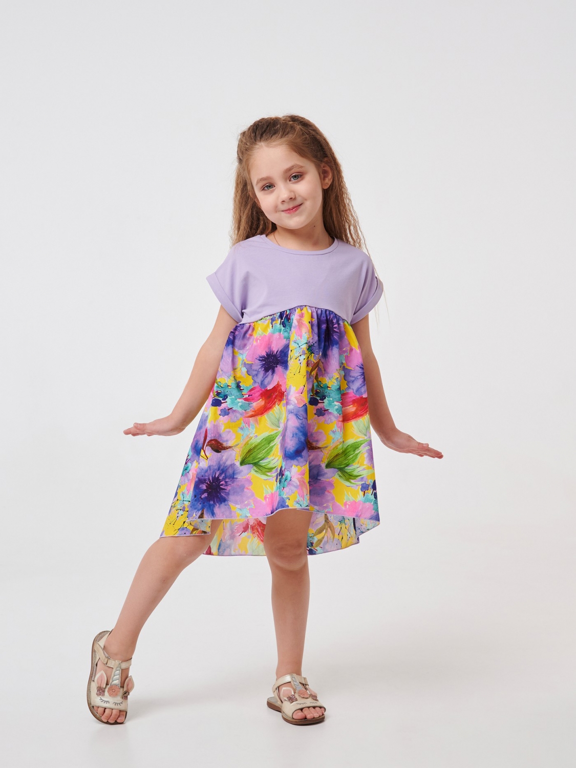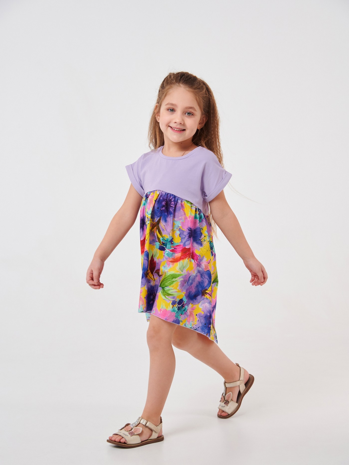 Літня сукня для дівчинки фіолетового кольору. Модель з короткими рукавами та круглим вирізом дівчинка зможе носити щодня, одягаючи на прогулянки. Верхня частина виробу пошита зі стрейчевого куліра, а нижня – з легкого ситця в принт квіти. Сукня вільного крою ззаду трохи подовжена, що робить його ще цікавішим.