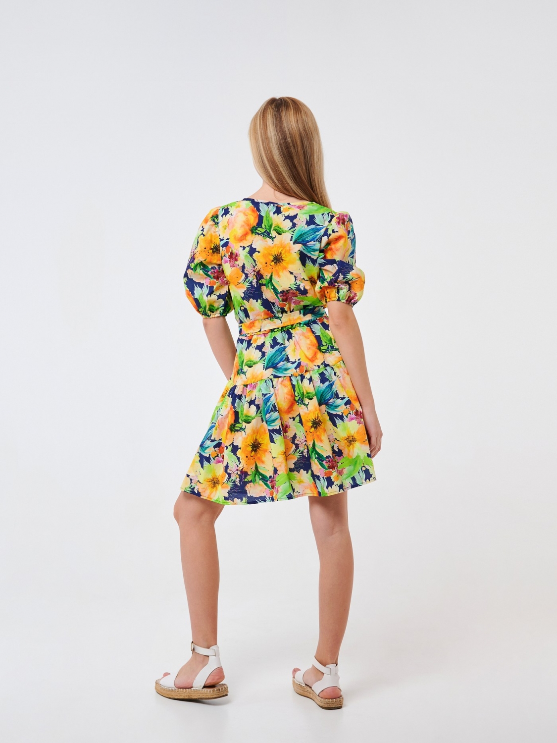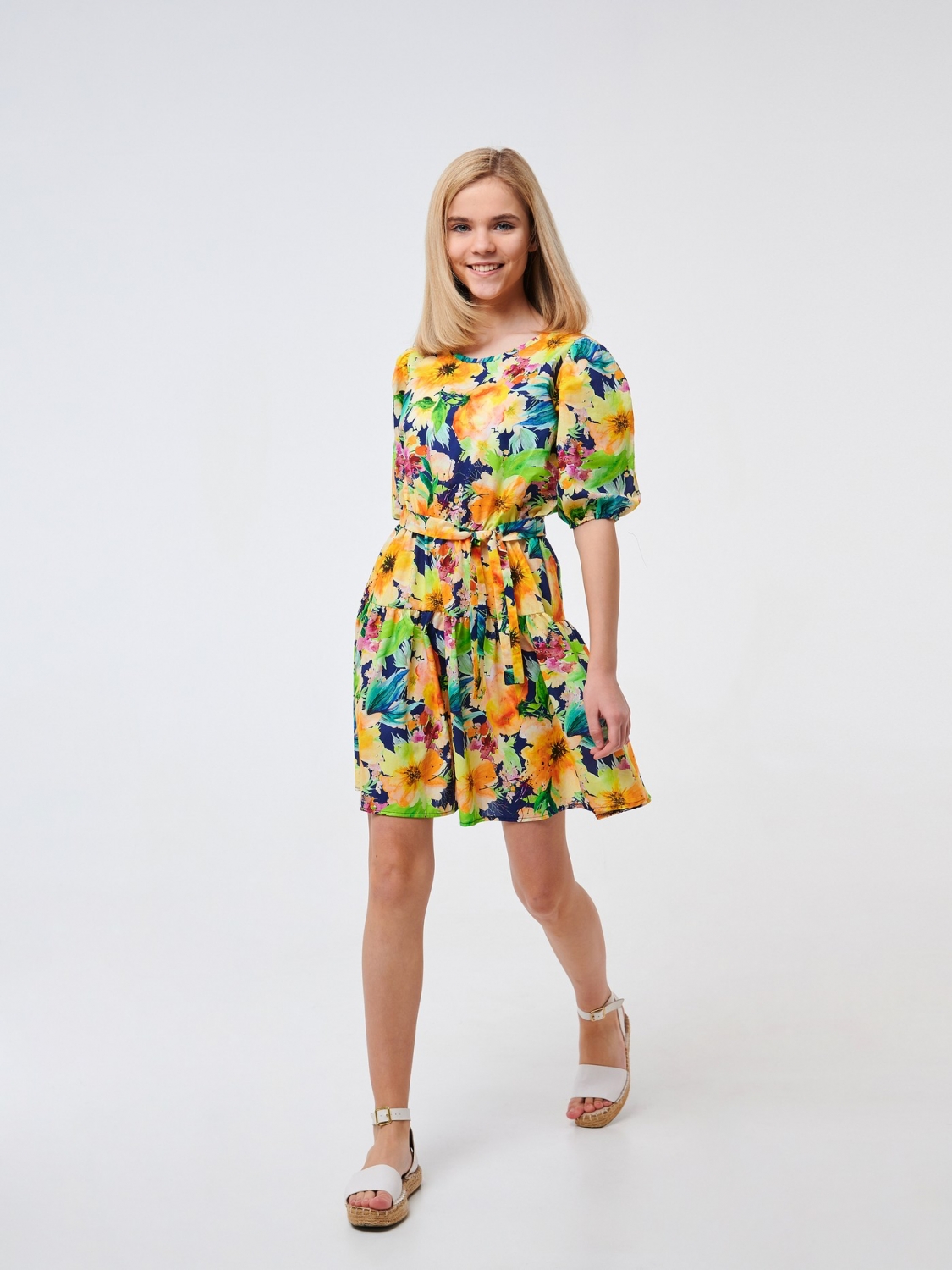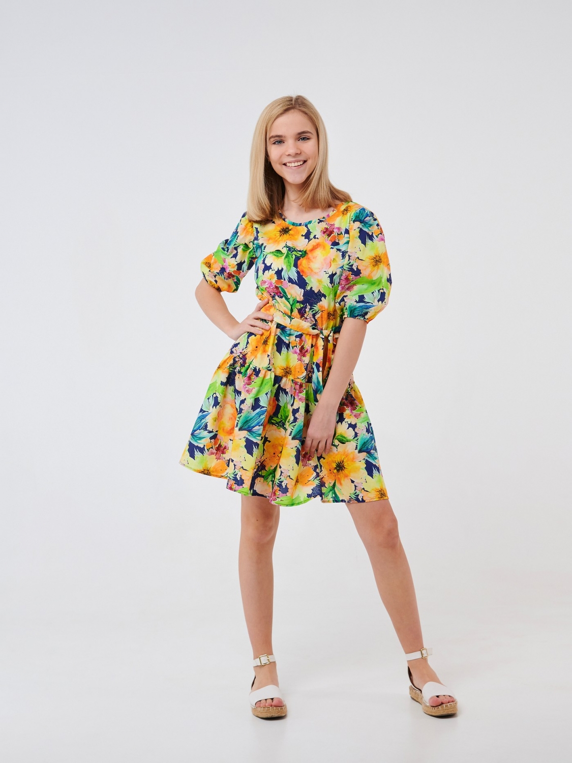 Приголомшливе плаття із ситцю. Виріб виконаний з натурального матеріалу, що добре пропускає повітря, легкого, м'якого. Воно ідеально підходить для літа. Модель з короткими рукавами, обробленими резинками, ідеально сидить на фігурі. Сукня із круглим вирізом горловини доповнена поясом на талії. Його можна носити на прогулянки.