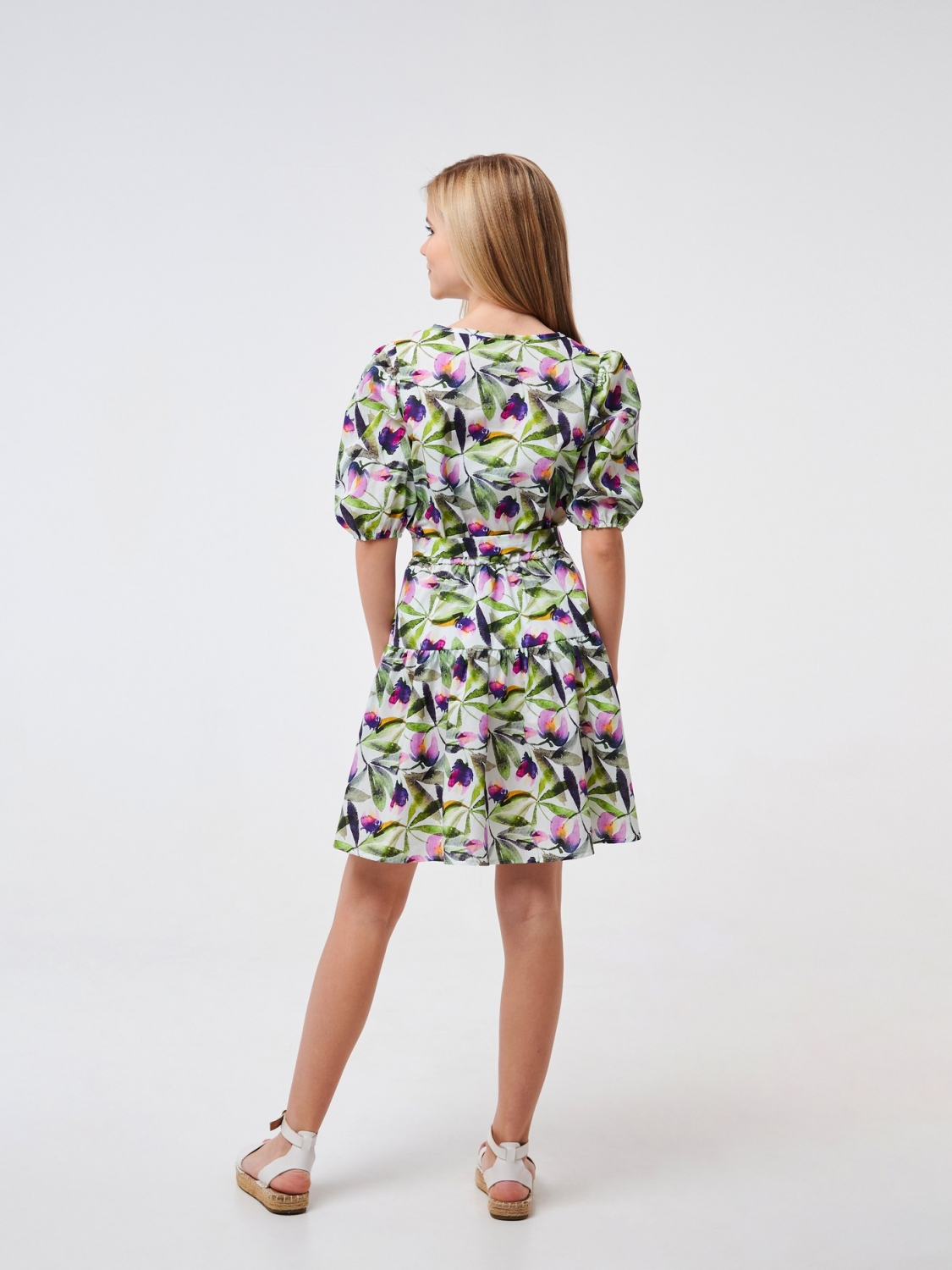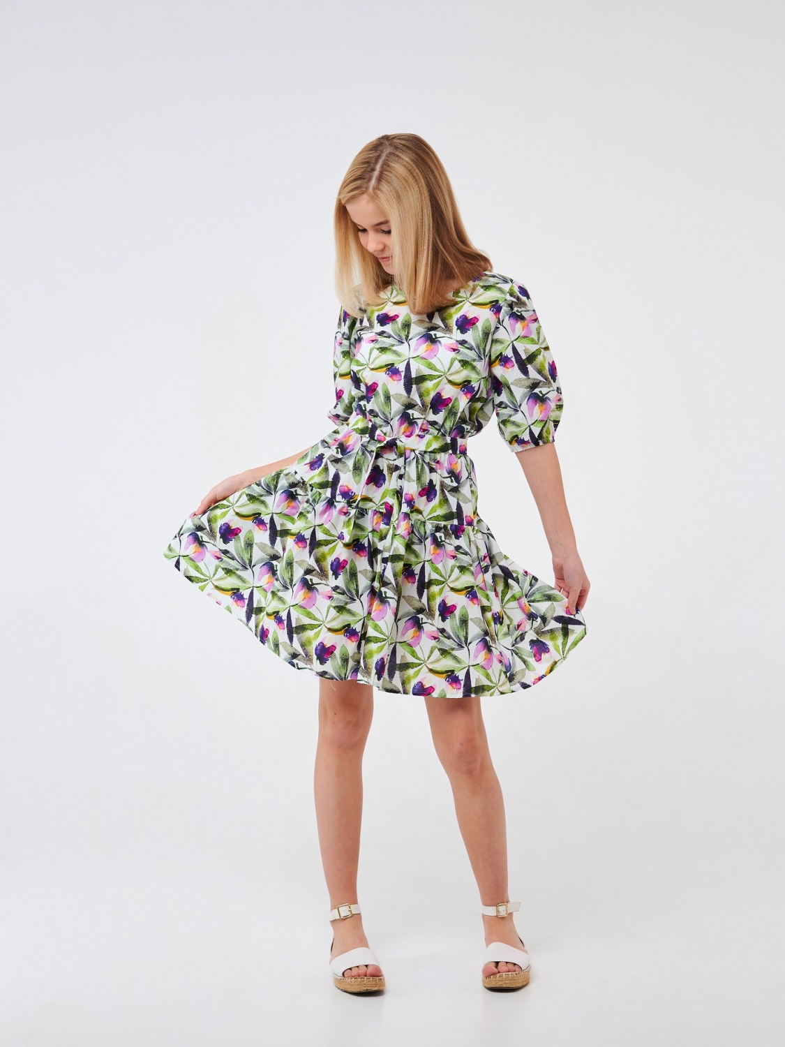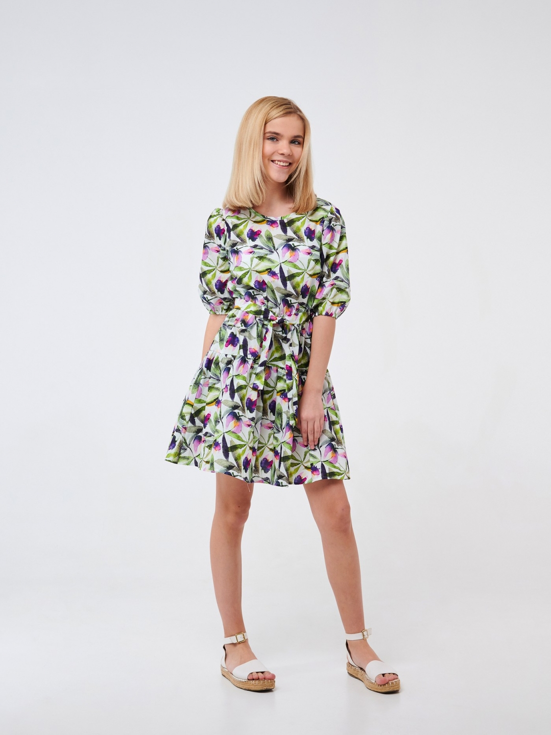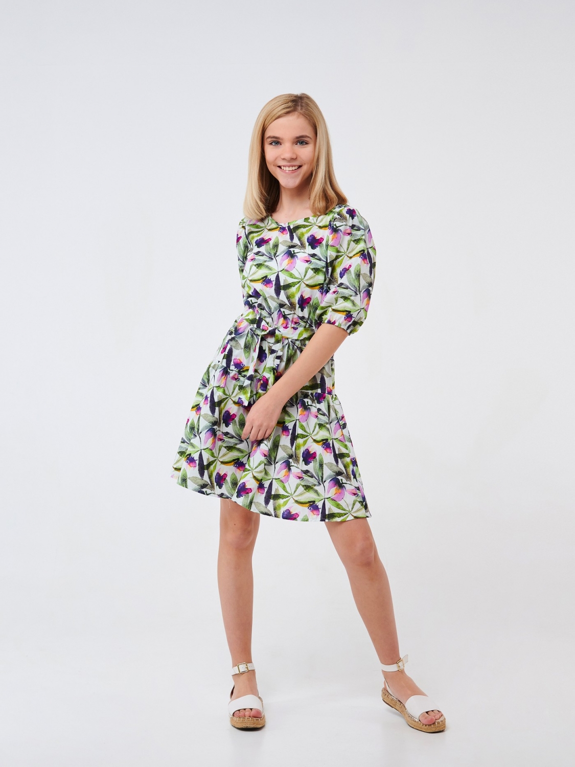 Ситцева сукня в романтичному стилі. Модель підійде для літніх прогулянок. Вона виготовлена з натурального бавовняного матеріалу з квітковим принтом. Виріб з короткими рукавами, обробленими резинками та поясом на талії добре сидітиме по фігурі. Легка, повітряна сукня стане для дівчинки улюбленим у гардеробі.