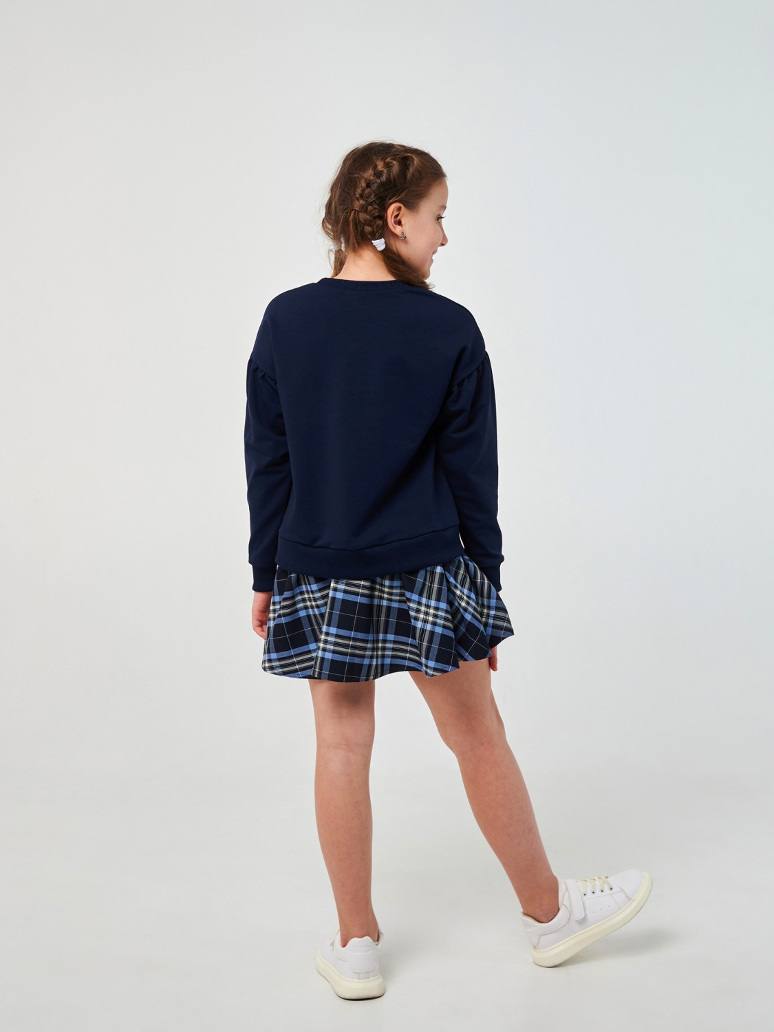 Представляємо вам нашу неймовірну сукню для дівчинки з довгим рукавом, з кроєм, що створює враження спідниці та світшота одночасно. Спідниця сукні пошита з синьо-блакитної тканини, що надає йому особливу елегантність і шарм. Світшот із полотна стрейчевого футера темно-синього кольору забезпечує максимальний комфорт та свободу рухів. Таке поєднання матеріалів створює візуальний ефект та приваблює захоплені погляди оточуючих. Оригінальні рукави сукні надають йому додаткового шарму та індивідуальності. Щоб додати особливого стилю та виразності, сукня прикрашена білою наклейкою флок із написом "persistence". Ця сукня ідеально підходить для різних випадків - чи це святкові заходи, зустрічі з друзями або повсякденні прогулянки. Воно дозволяє вашій дочці виглядати стильно та яскраво у будь-якій ситуації.