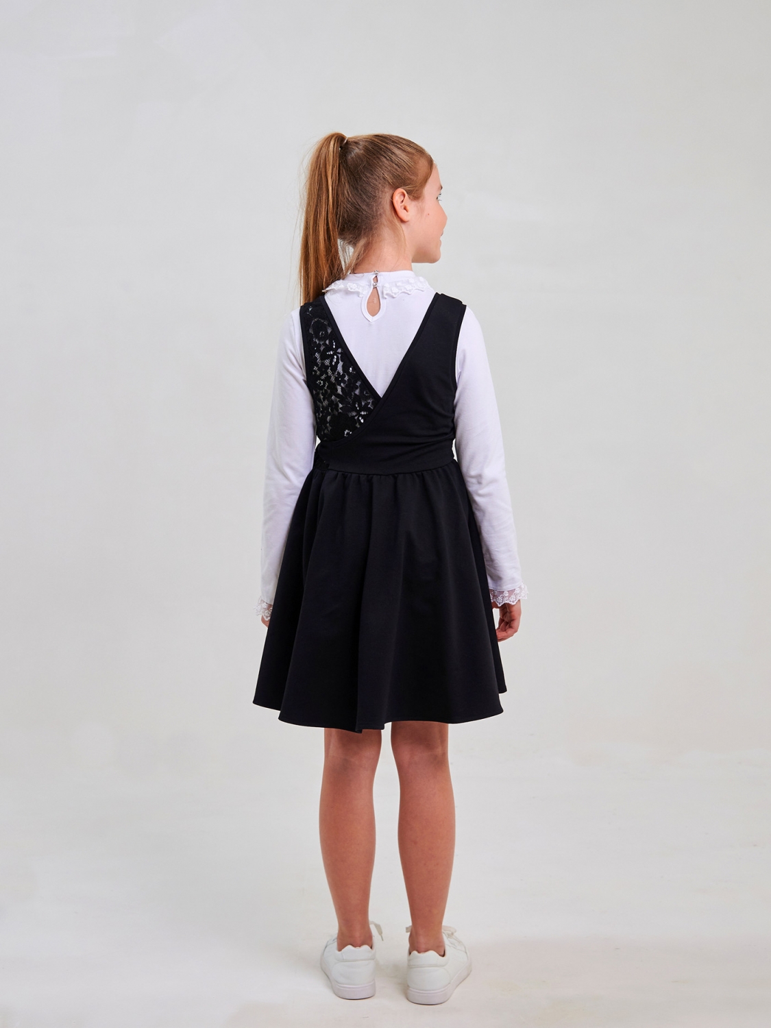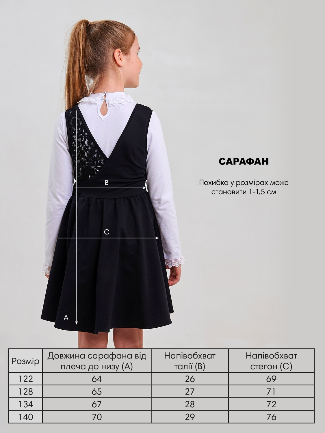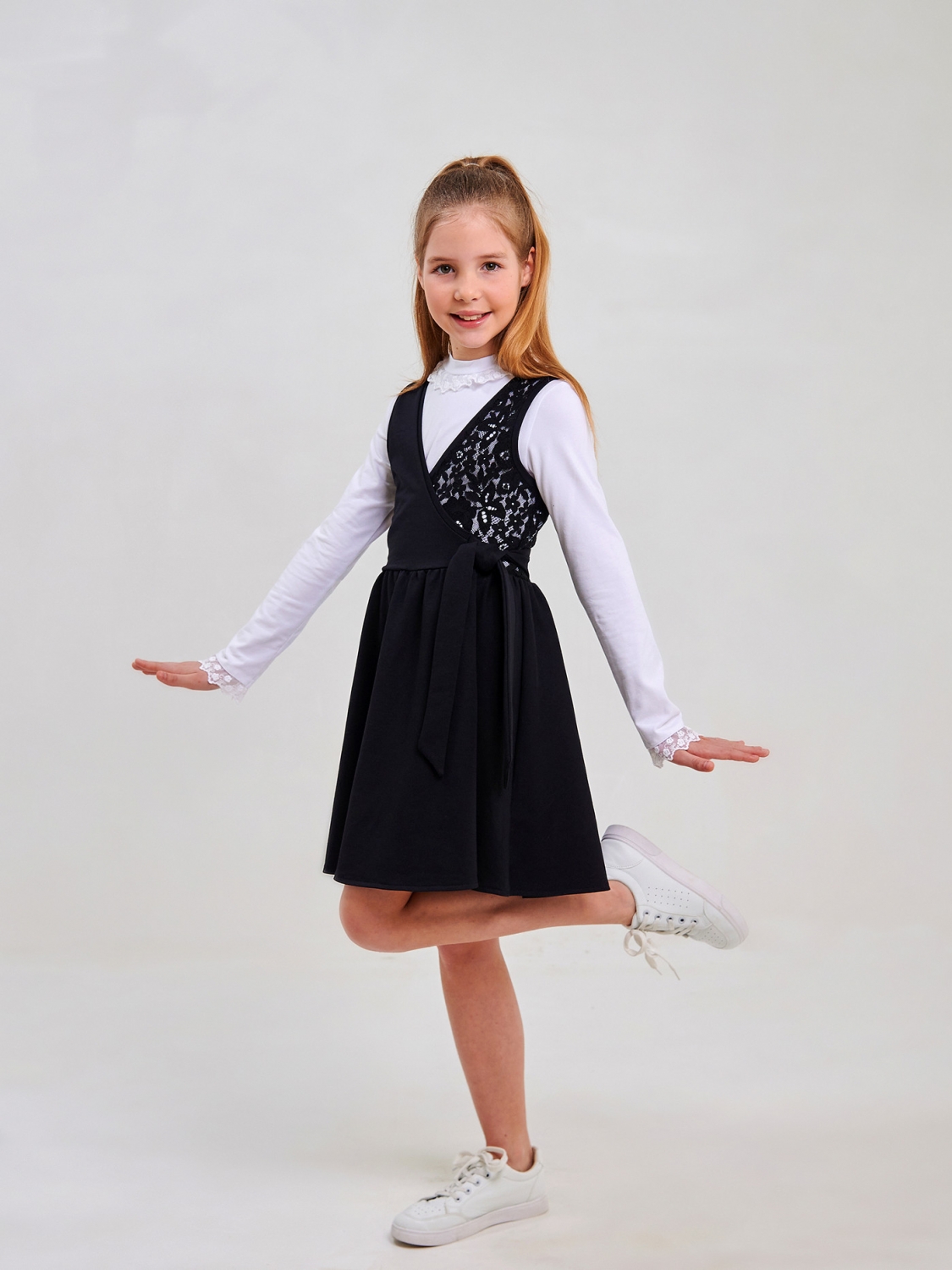 Елегантний та стильний сарафан для дівчинки, який ідеально підійде для особливих випадків та повсякденних образів! Сарафан пошитий з м'якого стрейчевого футера, що забезпечує максимальний комфорт та легкість рухів. Ліва поличка прикрашена вишуканим гіпюром, додаючи поряд нотку витонченості та елегантності. Пояс регулюється по талії, дозволяючи підігнати сарафан по фігурі та забезпечити ідеальну посадку. Цей функціональний елемент не тільки додає зручності, а й підкреслює індивідуальний стиль вашої маленької модниці. Сарафан чудово поєднується з блузками, футболками та гольфами, створюючи різноманітні образи для школи, прогулянок та урочистих заходів.