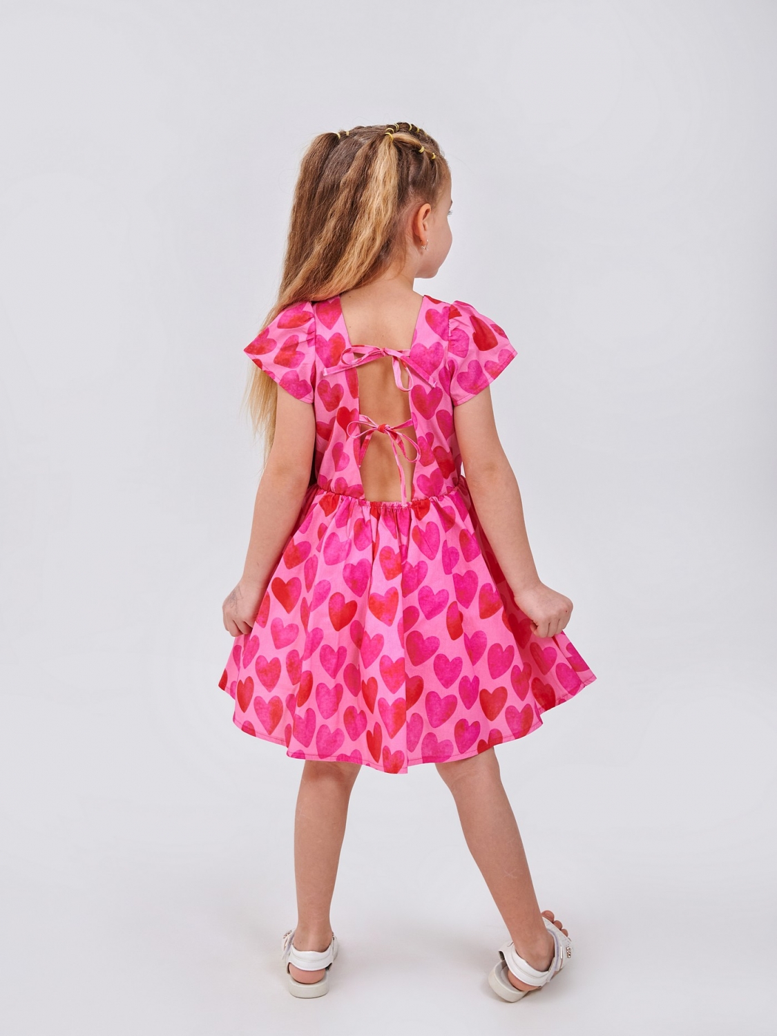 Чарівне плаття для дівчинки з повітряного ситця створене для сонячних днів та чарівних моментів. Малюнок у вигляді сердець наповнює образ ніжністю, а відкрита спинка на зав'язках додає витонченості та робить модель по-справжньому особливою. Ідеальний вибір для літніх прогулянок, свят та теплих днів!