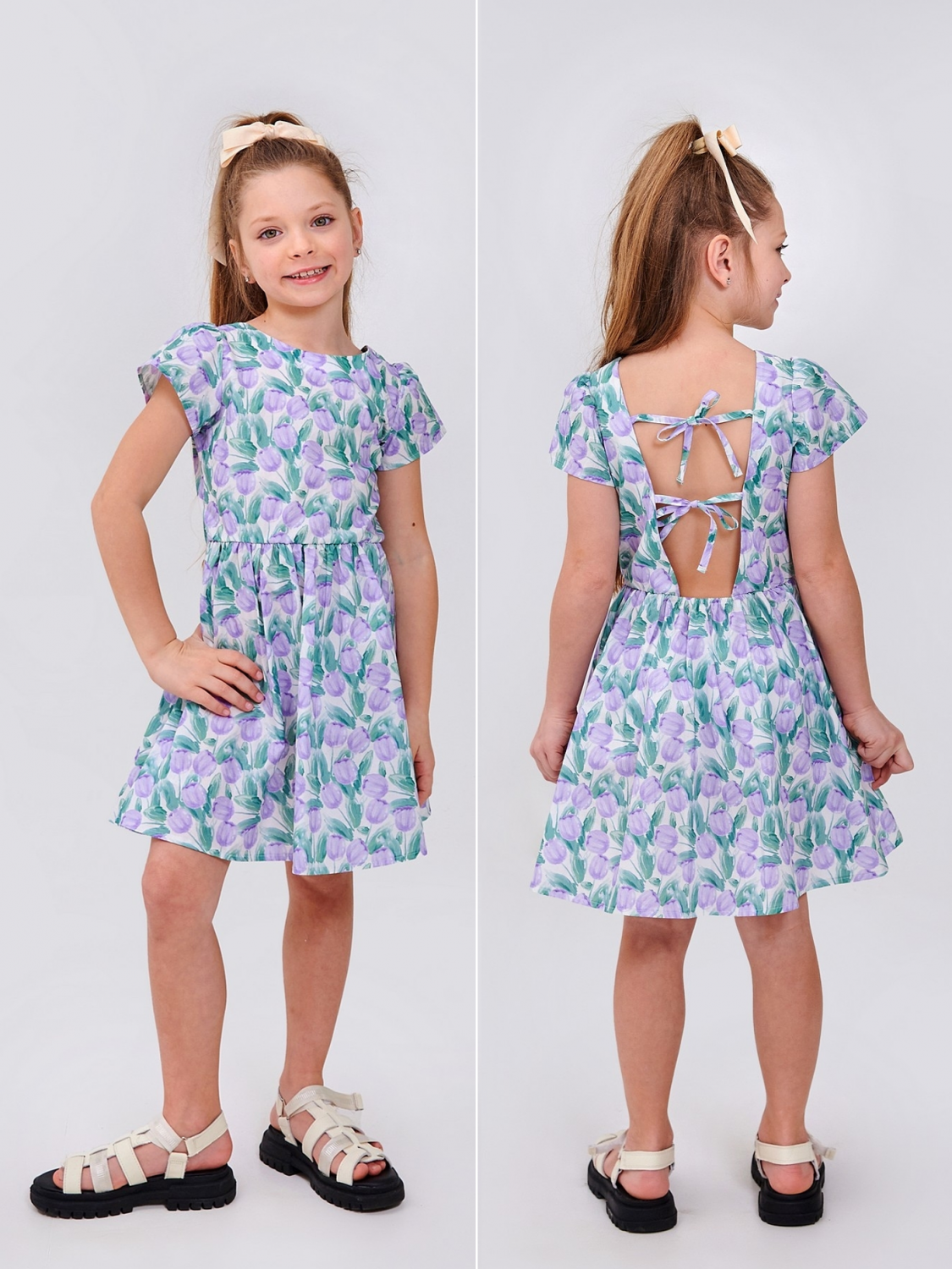 Легка сукня для дівчинки з ситця з витонченим малюнком лавандових тюльпанів - ідеальний вибір для теплих днів. Відкрита спинка на зав'язках додає образу витонченості та легкості, а ніжні відтінки створюють романтичний настрій. Ідеально для прогулянок, свят та сонячних літніх днів!