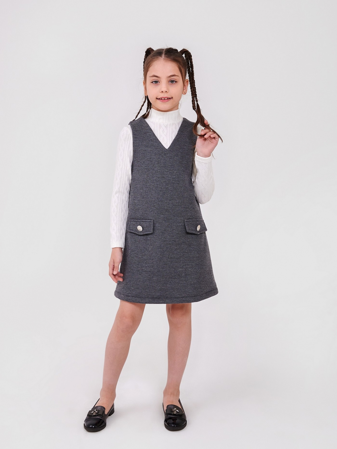 Стильний сарафан у відтінку темно-сірий меланж - ідеальний вибір для школи та особливих приводів. Прямий силует, V-подібний виріз та імітація кишень з ґудзиками надають образу акуратності та вишуканості. Лакоста з начосом - щільне та м'яке полотно. Зручна посадка і не сковує руху. Легко поєднується з гольфами, блузками та футболками.