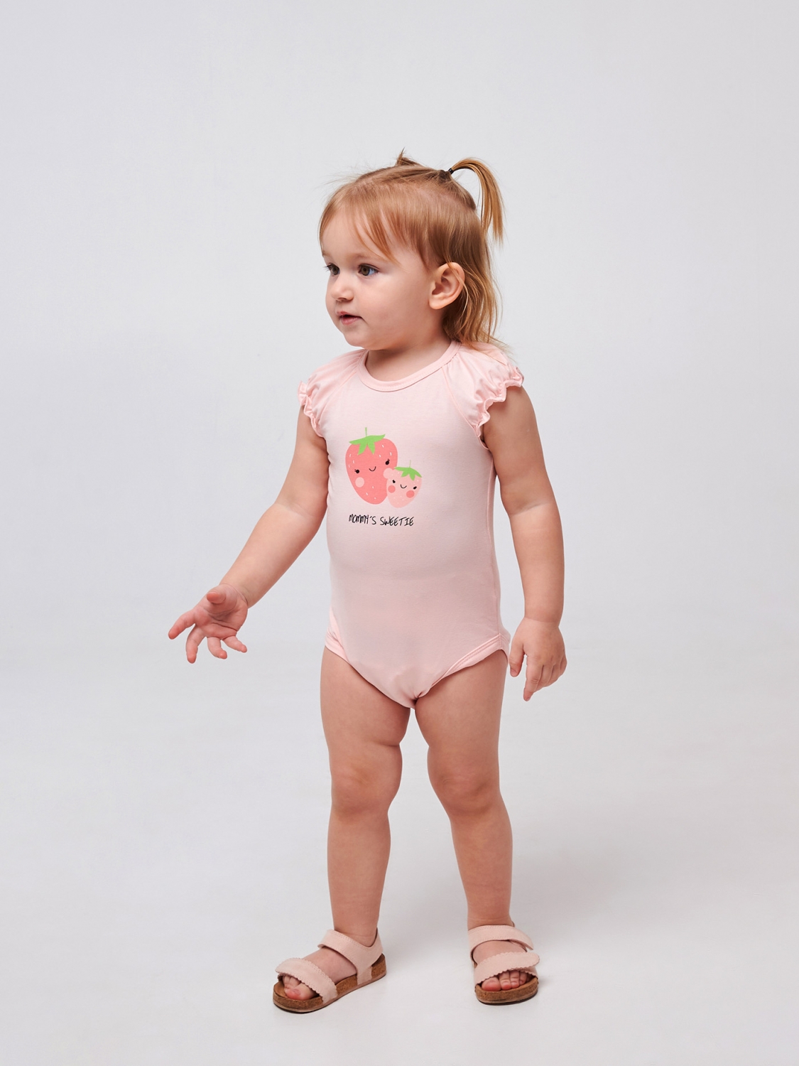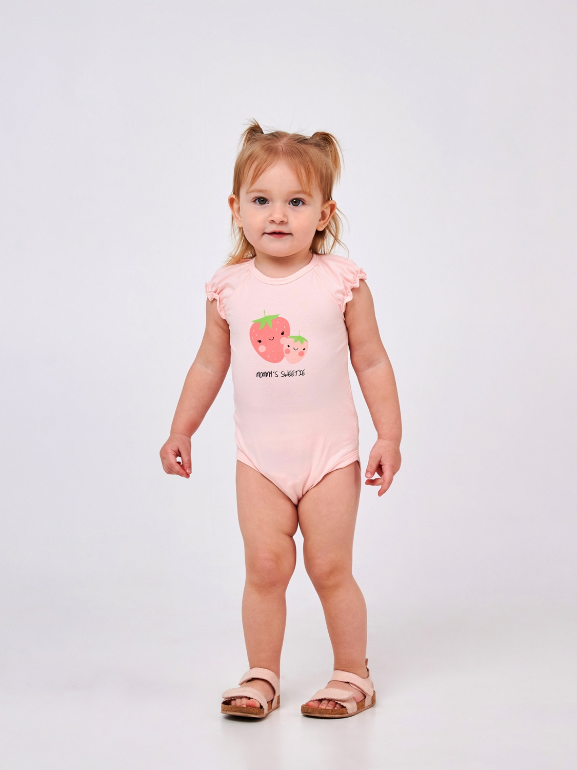 Бодік у кольорі рожевий персик з ніжним прямим друком полунички та милим написом 'Mommy's Sweetie'! Це прекрасне вбрання не тільки надасть вашій дитині чарівного вигляду, але й забезпечить їй максимальний комфорт. Рукавці бодіка прикрашені повітряними рюшами, додаючи образу вишуканості та ніжності. А наявність кнопочок як на спинці, так і внизу забезпечує легкість одягання та зняття. Полотно зі стрейчевого куліра дозволить вашій дівчинці насолоджуватися свободою руху.