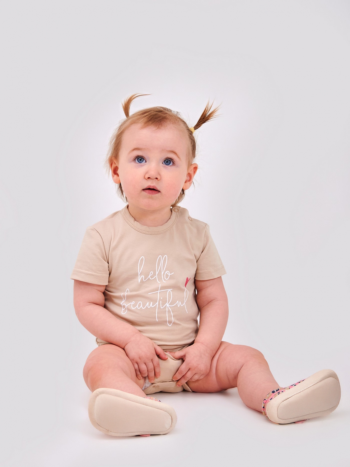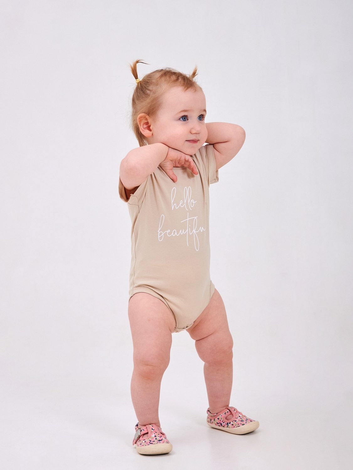 Боді-футболка для найменших модниць – зручно, стильно та практично! Стрейчеве кулірне полотно – м'якість, легкість та комфорт для ніжної шкіри. Прямий друк з написом "Hello Beautiful" - ніжний акцент для наймиліших образів. Зручні кнопки - легкість перевдягання та зміни підгузника без зайвого клопоту. Ваше малятко буде в центрі уваги з перших кроків!