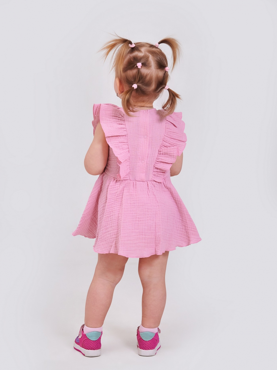 Чарівна боді-сукня для вашої дівчинки, виготовлена з м'якого мусліну. Ніжні рюші спереду та на спинці надають моделі вишуканого та зворушливого вигляду. Ідеально для перших фотосесій, теплих прогулянок та святкових моментів.