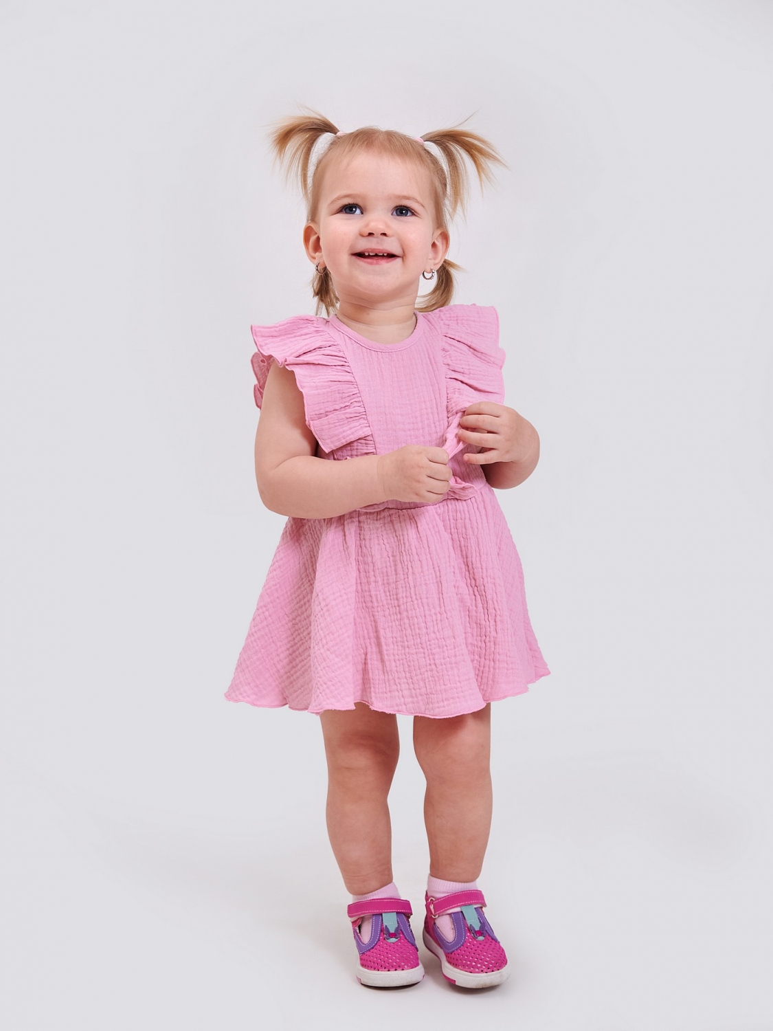 Чарівна боді-сукня для вашої дівчинки, виготовлена ​​з м'якого мусліну. Ніжні рюші спереду та на спинці надають моделі вишуканого та зворушливого вигляду. Ідеально для перших фотосесій, теплих прогулянок та святкових моментів.